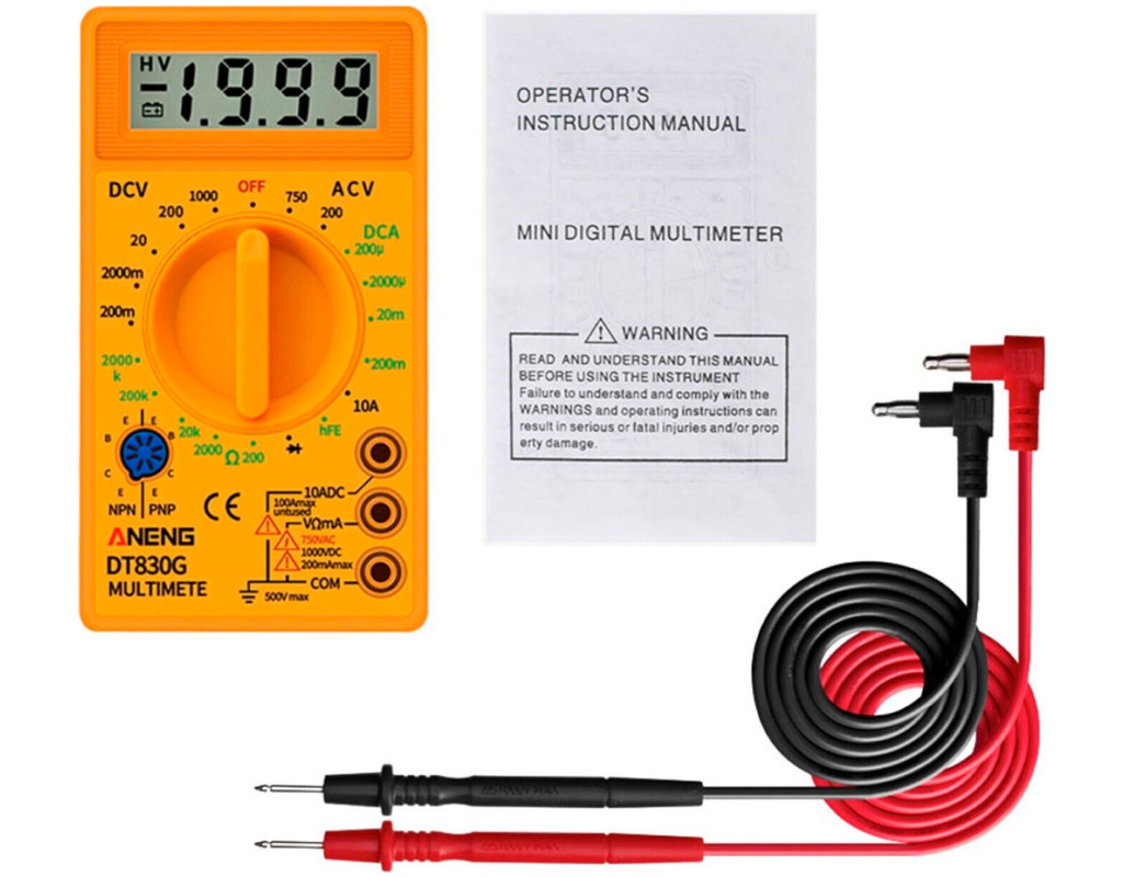 Особенности и преимущества цифрового мультиметра ANENG AN-DT830G: - Портативный цифровой мультиметр для измерения AC/DC напряжения, DC тока, сопротивления и тестирования транзисторов и диодов. - Эргономичный дизайн, небольшие размеры и крепкий корпус из ABS пластика обеспечивают надежную работу в бытовых и промышленных условиях. - Ручной диапазон измерений. - Четкий ЖК-дисплей с максимальным отображаемым значением 1999. - Функция индикации низкого заряда батареи предупредит пользователя о необходимости замены батарей.