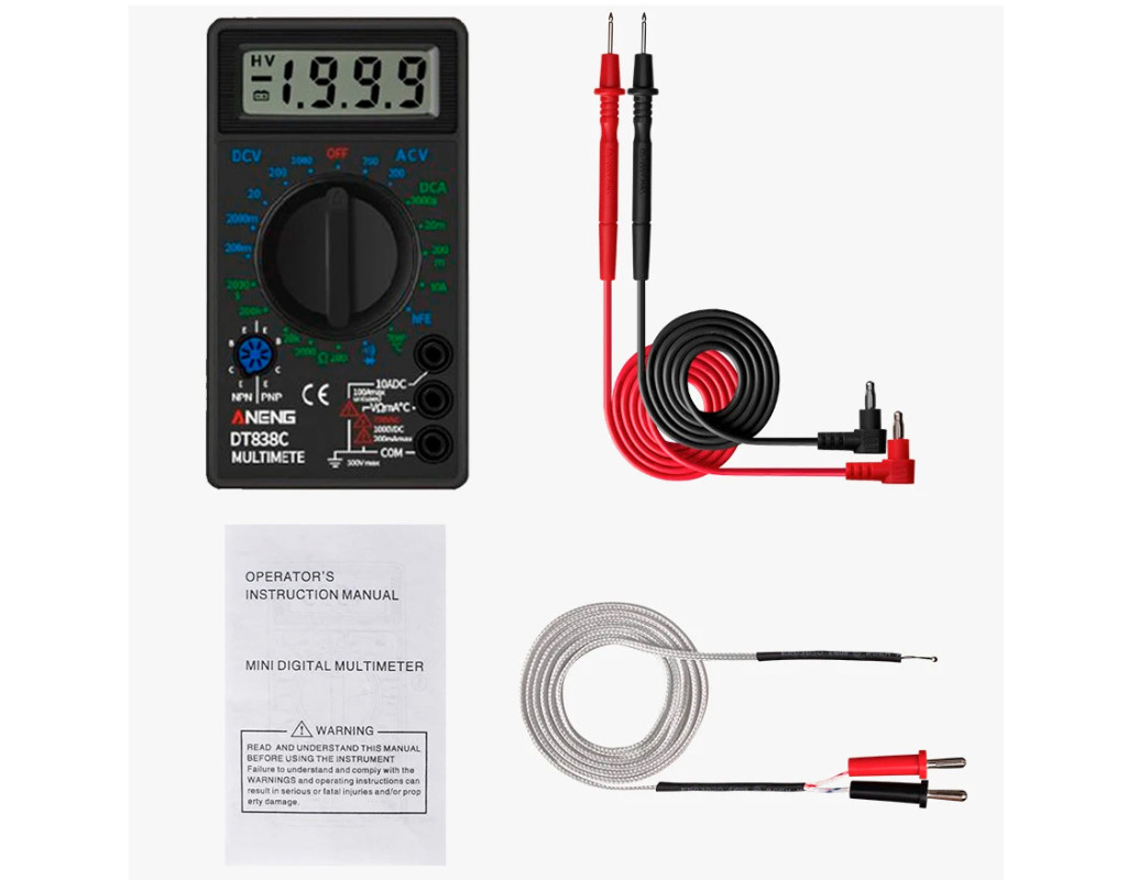 Мультиметр Aneng AN-DT838C - это универсальное и надежное устройство для измерения DC/AC напряжения, тока, сопротивления и температуры. Это неотъемлемый инструмент для электриков, техников и энтузиастов по обслуживанию электронного оборудования. С помощью этого мультиметра, вы можете быстро и точно измерить различные электрические параметры, что очень полезно при обнаружении и устранении неполадок в электрических цепях и устройствах. Особенности и характеристики мультиметра Aneng AN-DT838C: