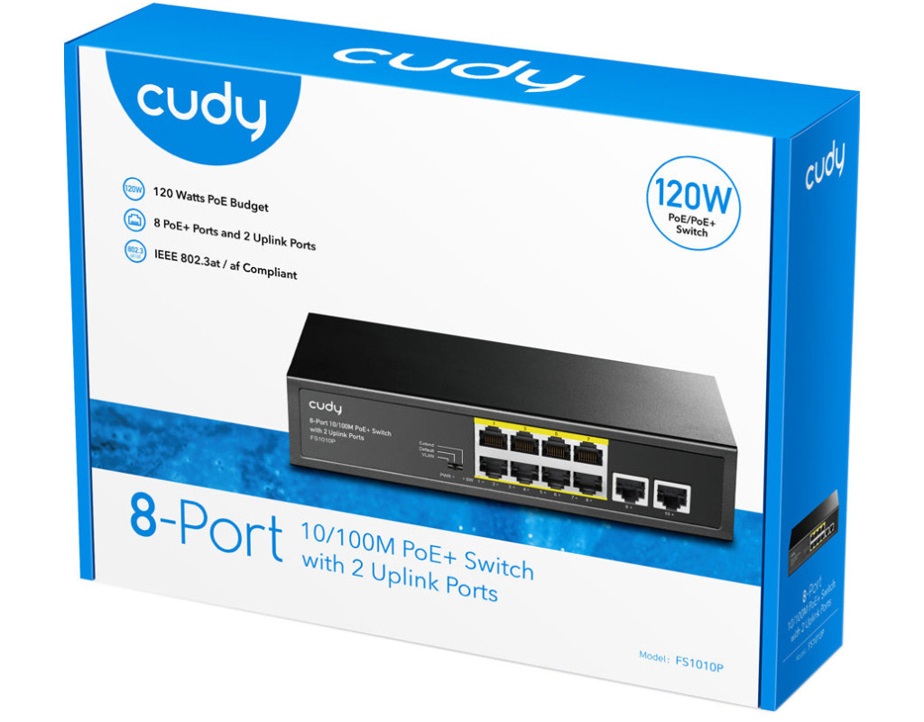 | Коммутатор Cudy FS1010P соответствует стандарту IEEE802.3af/at. Используйте его для IP камер, IP телефонии, построения сетей Wi-Fi для бизнеса и других потребностей. Коммутатор оснащен двумя портами RJ45 Uplink 10/100 Мбит/с и восемью портами FE с 802.at/af Mode A PoE, которые независимы друг от друга и поддерживают питание по витой паре PoE с суммарной мощностью до 120 Вт. Автоматическое определение питания позволяет подавать 32 Вт на устройства 802.3at PoE+ и 15.4 Вт на устройства 802.3af PoE. Кроме стандартного режима по умолчанию, коммутатор Cudy FS1010P поддерживает работу в режиме CCTV для работы на больших дистанциях и VLAN для лучшей безопасности. Встроенный вентилятор обеспечивает охлаждение внутренних компонентов коммутатора, а его металлический корпус с вентиляционными отверстиями способствует лучшему рассеиванию тепла. Коммутатор Cudy FS1010P имеет встроенную молниезащиту 6 кВ и защиту от электростатического разряда 8 кВ. Он подходит для установки в большинстве сред. |