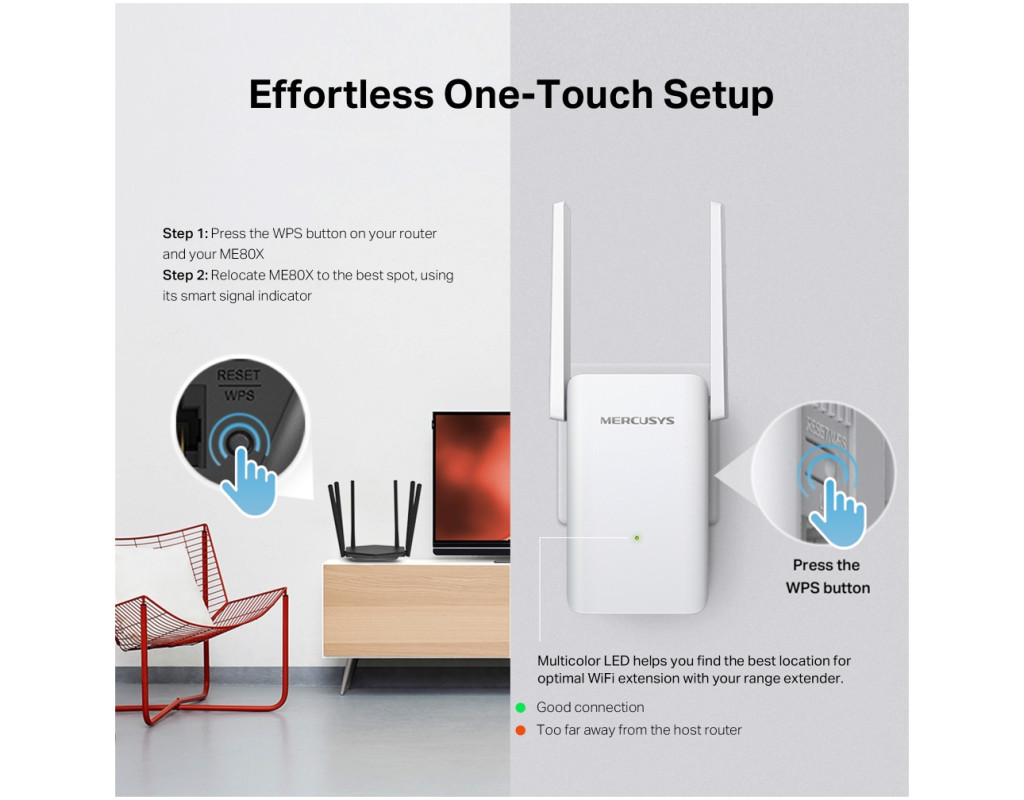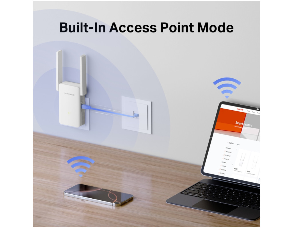 Wi-Fi 6 выводит вашу сеть на новый уровень Оснащенный Wi-Fi 6, ME80X улучшает практически все аспекты вашей сети: скорость, эффективность и пропускную способность. Расширяйте Wi-Fi там, где он вам больше всего нужен Расширьте зону покрытия маршрутизатора. Этот ретранслятор AX3000 с двумя регулируемыми антеннами с высоким коэффициентом усиления усиливает Wi-Fi в труднодоступных местах и совместим со старыми стандартами WiFi (11b/g/n/a/ac) и всеми подключенными устройствами. Покройте весь свой дом с помощью EasyMesh ME80X совместим с EasyMesh, что позволяет настроить целую домашнюю mesh-сеть с одним именем WiFi и паролем с любыми другими точками доступа, которые поддерживают EasyMesh от нескольких поставщиков. Наслаждайтесь гибким, масштабируемым и бесшовным Wi-Fi по всему дому! Гибкое расширение радиуса действия WiFi. Работает с различными вендорами. Бесперебойное соединение Wi-Fi. Настройка одним прикосновением без усилий Нажмите кнопку WPS на маршрутизаторе и кнопку WPS на расширителе, чтобы расширить покрытие Wi-Fi за считанные секунды. Шаг 1: Нажмите кнопку WPS на маршрутизаторе и ME80X. Шаг 2: Переместите ME80X в лучшее место, используя его умный индикатор. Цветной светодиод поможет вам найти лучшее место для оптимального расширения Wi-Fi с помощью ретранслятора. Режим встроенной точки доступа ME80X - это больше, чем ретранслятор WiFi. Подключите его к проводному Интернету через Ethernet, чтобы превратить его в двухдиапазонную точку доступа Wi-Fi. Управление на кончиках ваших пальцев Настраивайте и управляйте WiFi через приложение MERCUSYS со своего смартфона (Android, iOS). |