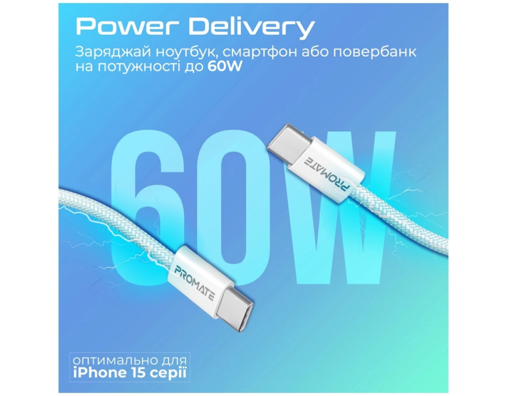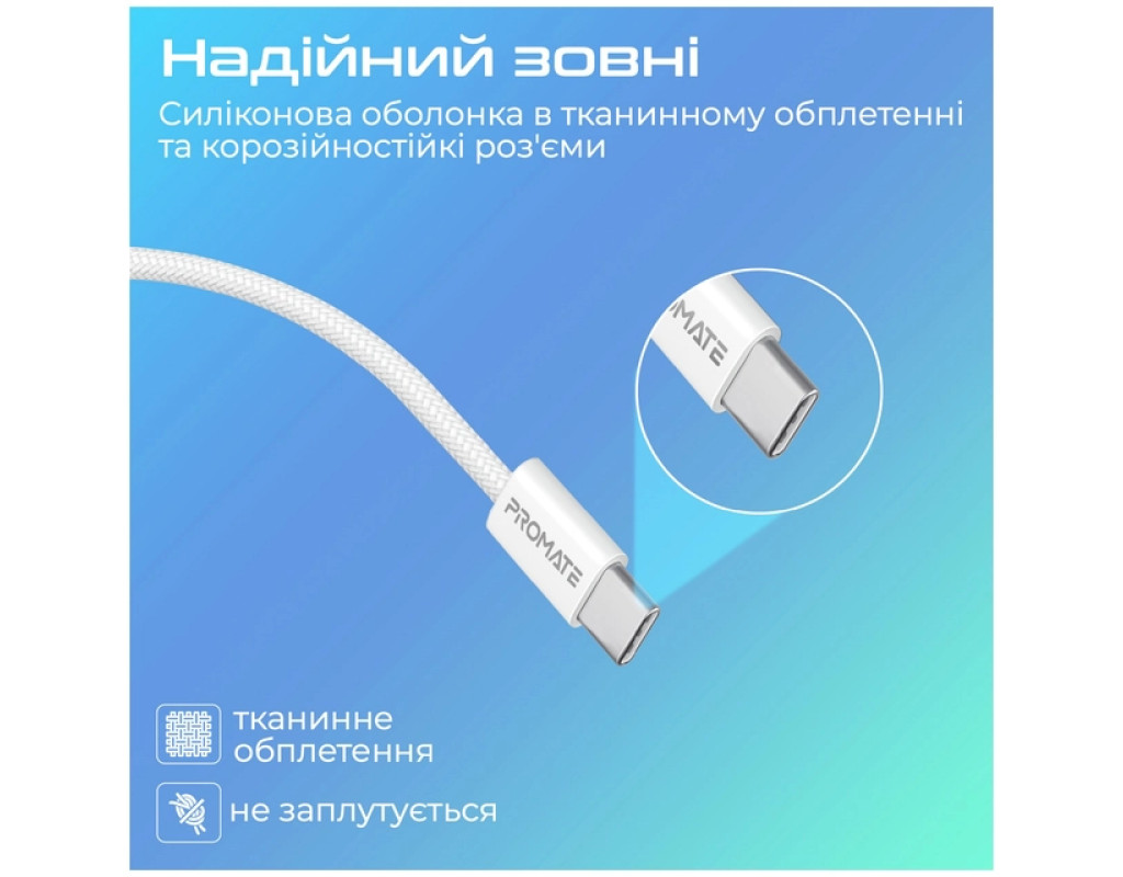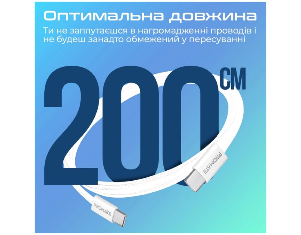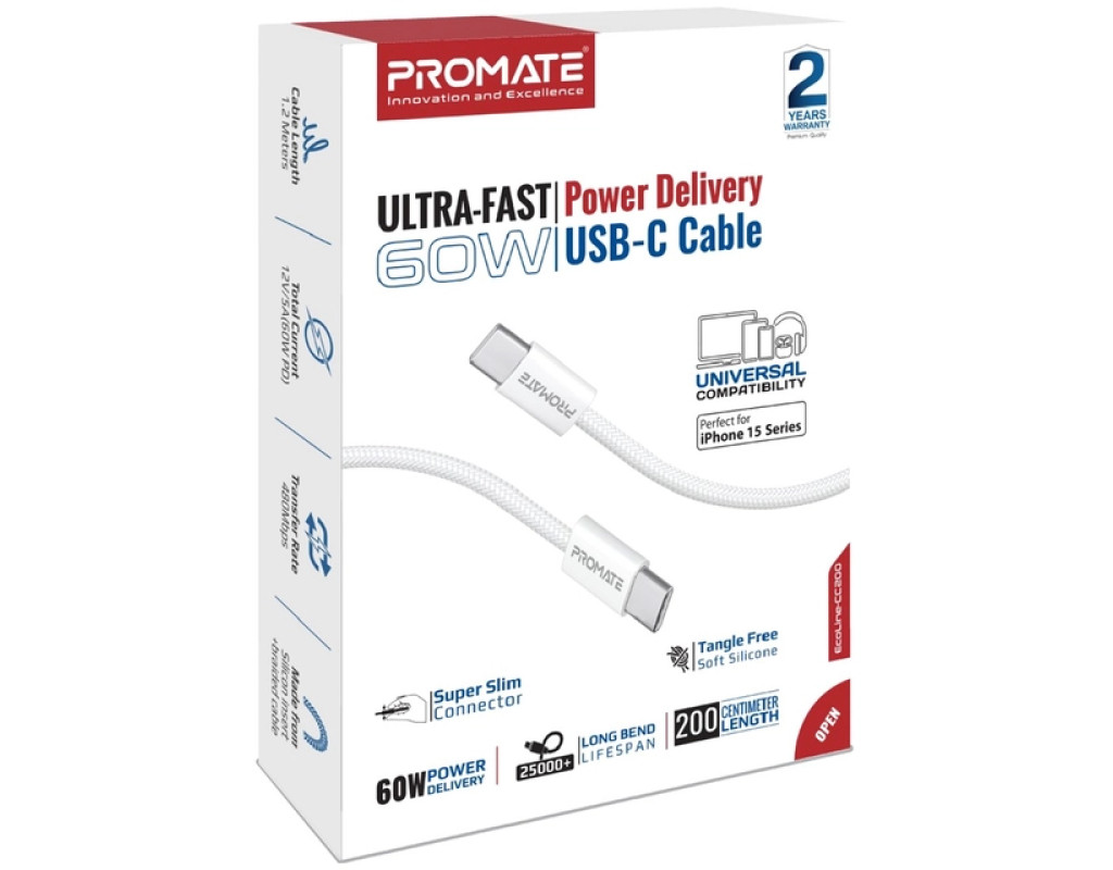 Дата кабель USB-C to USB-C 2.0m 60W PD EcoLine-CC200 white Promate (ecoline-cc200.white)