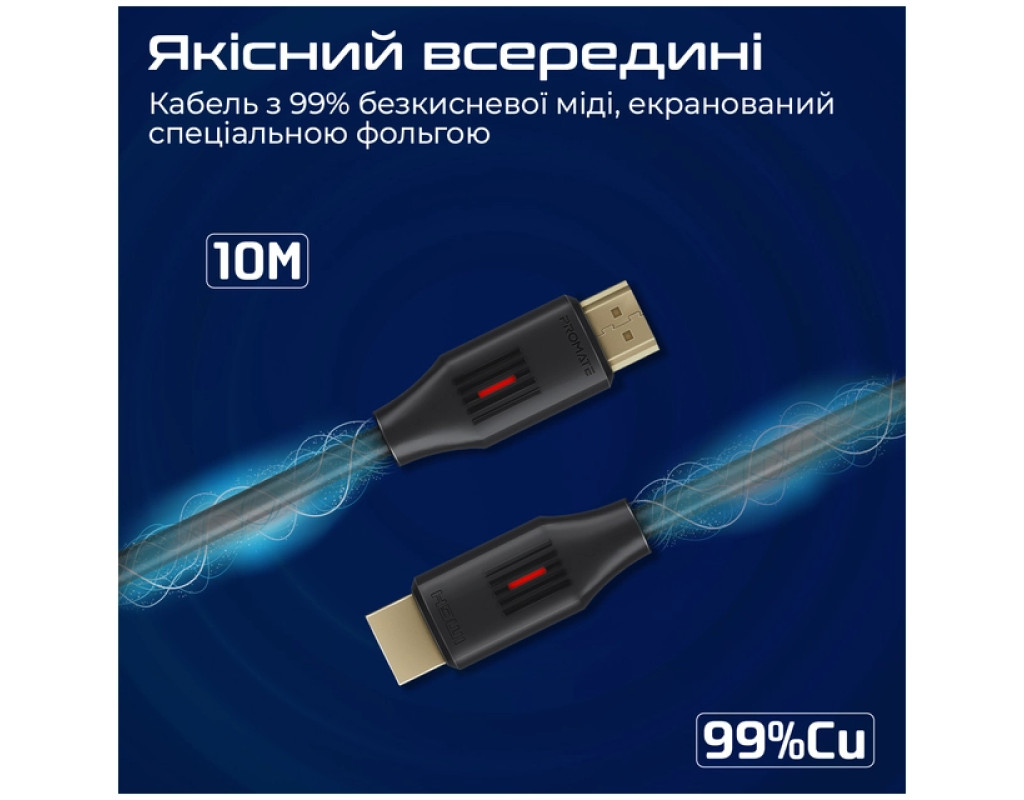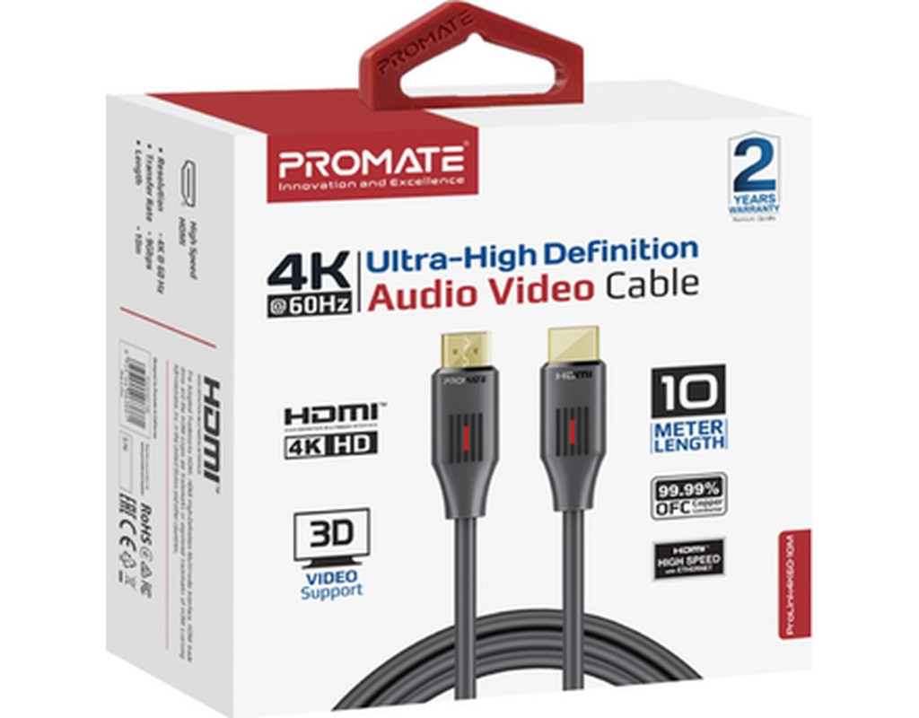 Выводи изображение на внешний дисплей в разрешении UHD 4K с помощью надежного HDMI кабеля Promate ProLink4K60-10M.