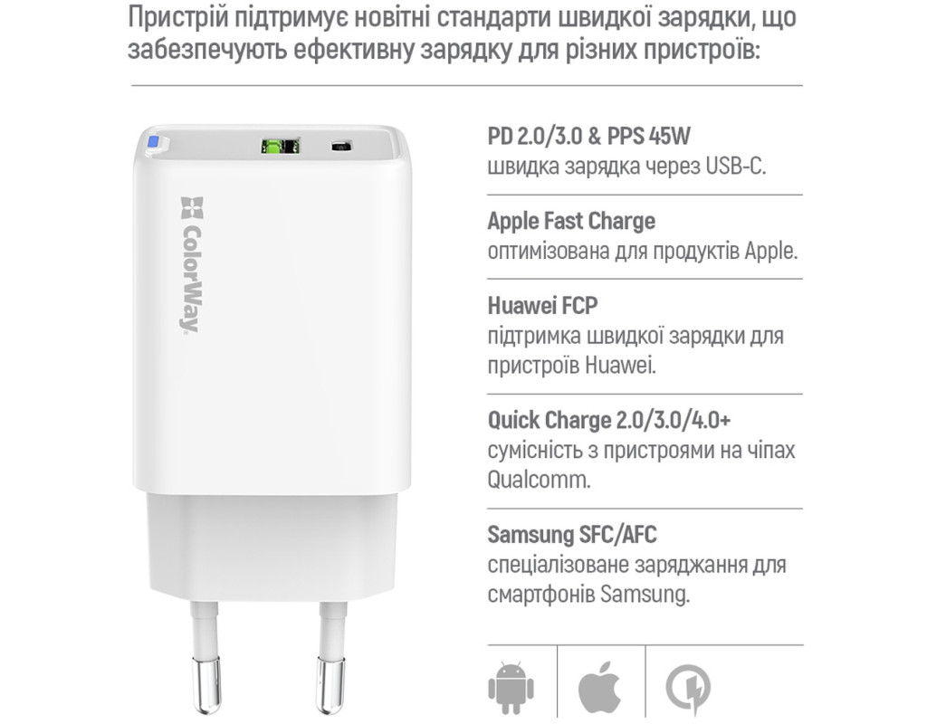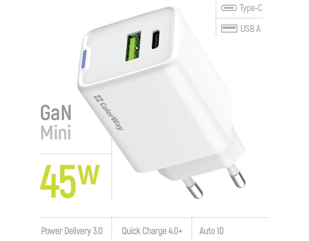| Зарядное устройство ColorWay C101E GaN Mini 45W PD PPS USB-C + USB-A QC4.0 white (CW-CHS060PD-WT) сочетает в себе мощность, компактность и надежность, благодаря чему идеально подходит для современной жизни. Использование революционной технологии GaN (нитрид галлия) обеспечивает уменьшение размера устройства, делая его лёгким и портативным решением для вашего зарядного арсенала. Совместимость с различными технологиями быстрой зарядки, такими как Power Delivery 2.0, 3.0, Programmable Power Supply (PPS), Quick Charge 2.0, 3.0, 4.0 и Apple Fast Charge, позволяет устройству легко заряжать разнообразную электронику. С максимальной выходной мощностью 45 Вт этот адаптер способен эффективно обслуживать планшеты, смартфоны, фитнес-браслеты, TWS наушники, геймпады, экшен-камеры и другое. Зарядное устройство оснащено интеллектуальной микросхемой USB Auto ID, которая автоматически подбирает необходимое напряжение и ток, обеспечивая быстрые и безопасные решения для зарядки без риска для ваших гаджетов. Система многоуровневой защиты от короткого замыкания, перенапряжения, перегрева и перегрузок гарантирует максимальную безопасность. Корпус устройства, изготовленный из огнестойкого ABS-пластика, обеспечивает его долговечность и надежность. Эргономичный дизайн, гармонирующий с функциональными характеристиками, позволяет использовать ColorWay GaN Mini как дома, так и в пути. Подключайтесь к миру технологий с комфортом и уверенностью с помощью этого мощного зарядного устройства. |