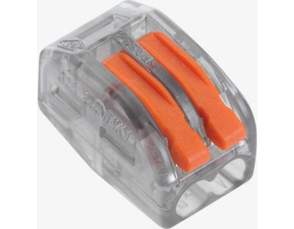 WAGO 222‑412, 50 шт — двухконтактный push-in соединитель (Lever‑Nuts®) для быстрого и надежного соединения проводов 0,08–2,5 мм, напряжение до 600 В, многократное использование, прозрачный корпус. |