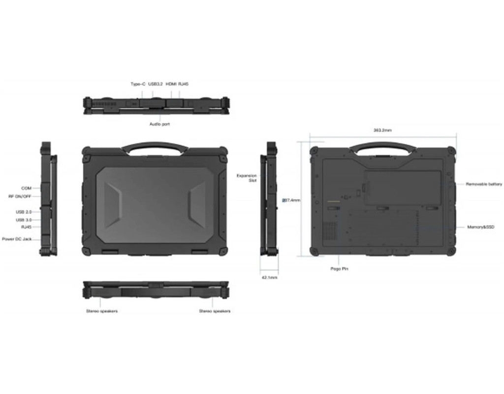 Прочный защищенный ноутбук AGN X14A – отличный выбор для людей, деятельность которых связана с полевыми условиями. Берите его с собой на производство, склады или строительные площадки – этот гаджет предназначен для использования в сложных эксплуатационных условиях. Ноутбук прошел ряд лабораторных испытаний по новейшей версии стандарта MIL-STD-810Н, разработанного для оборонной промышленности. Он устойчив к ударам, падениям с высоты до 1.22 м, воздействию высоких и низких температур, вибрации и других отрицательных факторов. Уровень защиты от пыли и влаги IP65 означает, что ноутбук полностью защищен от попадания пыли и влаги. AGN X14A работает на основе надежного процессора Intel Core i5 с встроенной графической системой Intel Iris Xe. Он поможет быстро и качественно реализовать проекты любого уровня сложности. Быстрая оперативная память и высокопроизводительный твердотельный накопитель объемом 512 ГБ обеспечивают эффективную работу в многозадачном режиме – загружайте большие файлы и получайте к ним доступ в считанные секунды. FHD LCD экран отображает четкое реалистичное изображение даже при интенсивном освещении. Встроенные 5MP веб-камера, микрофон и динамики делают ноутбук отличным вариантом для проведения видеоконференций. Ноутбук оснащен тремя портами USB-A, два из которых поддерживают скорость обмена данными до 5 Гбит/с, портом USB-C, разъемами HDMI и RS232 – подключайте все необходимые периферийные устройства, мониторы, проекторы и т.д. Подключение к сети осуществляется посредством интерфейса RJ-45 или беспроводной технологии Wi-Fi 6. Используйте технологию Bluetooth 5.1 и обменивайтесь данными с подключенными устройствами на расстоянии до 10 м. Ноутбук AGN X14A отлично работает с навигационной системой GPS, он поможет определиться с оптимальным направлением движения, когда вы находитесь в пути. Автономную работу этого защищенного ноутбука обеспечивают два аккумулятора – встроенный аккумулятор емкостью 1300 мА*ч и съемный аккумулятор емкостью 4850 мА*ч, поддерживающий функцию горячей замены. Встроенная в корпус ноутбука AGN X14A ручка делает его удобным для переноски без сумки или рюкзака. |