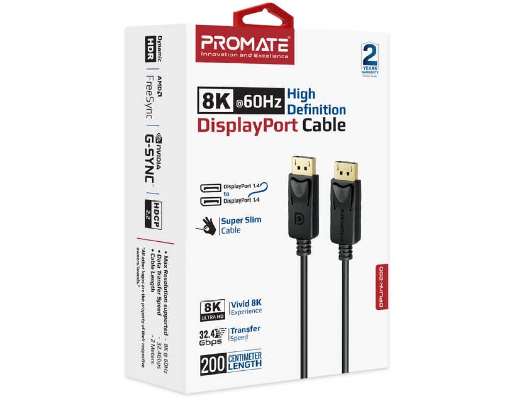 Promate DPLink-200 - премиальный DisplayPort кабель с позолоченными коннекторами и автоматическими фиксаторами. Смотри фильмы и сериалы, слушай музыку или играй в видеоигры в разрешении 8K UltraHD (7680х4320) 60Гц без помех и потери качества.