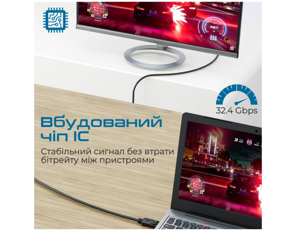 - Непревзойденное качество: Встроенный чип IC обеспечивает передачу сигнала без потери битрейта между устройствами с интерфейсом DisplayPort.