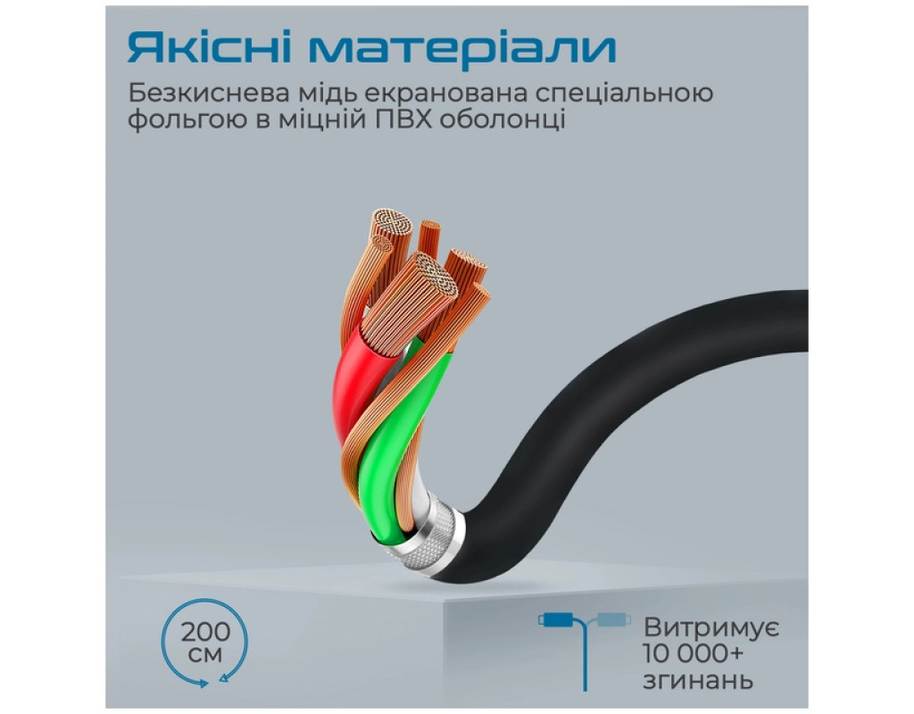 - Надежный снаружи: Износостойкая ПВХ оболочка в нейлоновой оплетке и протекторы возле коннекторов выдерживают более 10 000 сгибаний.