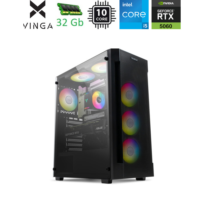 Компьютер Vinga Wolverine D8819, с операционной системой Windows 11 Home, объединяет преимущества игровой платформы и современной рабочей станции. Это оптимальный вариант для большинства актуальных игр на средних и высоких настройках графики, а также повседневных и рабочих задач. Процессора Intel Core i5-12400KF Процессор Intel Core i5-12600KF – это мощный 10-ядерный процессор (4 эффективных и 6 производительных ядер), используемый в сборнике Vinga Wolverine D8819. Тактовая частота в эффективном режиме составляет 2.8 ГГц и для производительного 3.7 ГГц производительного ядра, а для решения динамических нагрузок она поднимается до 3.6 и 4.9 ГГц. Это возможно благодаря технологии Turbo Boost. Но такой рост производительности приводит к большому тепловыделению – 150 Вт. Чтобы процессор не давал сбоев высоким температурам, используется хорошее охлаждение. К преимуществам Intel Core i5-12600KF относятся 20 МБ кэша, поддержка 16 потоков, возможность использования быстрой оперативной памяти DDR5. Процессор позволяет установить ОЗУ DDR4 3200 МТ/с или DDR5 5600 МТ/с объемом 128 ГБ. Игровая видеокарта GeForce RTX 5060 Vinga Wolverine D8819 гарантирует хорошее изображение как в играх, так и при просмотре видео. Это заслуга видеокарты GeForce RTX 5060, которая вышла в 2025 году. RTX 5060 – это передовой графический ускоритель, созданный на базе архитектуры NVIDIA Blackwell. Инновационные RT-ядра четвертого поколения и мощные тензорные ядра пятого поколения обеспечивают прорывные возможности нейронного рендеринга и максимальную производительность в самых требовательных задачах. В видеокарте GeForce RTX 5060 благодаря новой микроархитектуре внедрены элементы машинного обучения. В частности, технология NVIDIA DLSS 4 обеспечивает исключительное качество сглаживания и улучшает производительность. В результате вы сможете наслаждаться воспроизведением видео в формате 4K с частотой обновления до 480 Гц или 8K с частотой 165 Гц благодаря поддержке DSC (Display Stream Compression). Основные характеристики дискретной карты GeForce RTX 5060:
