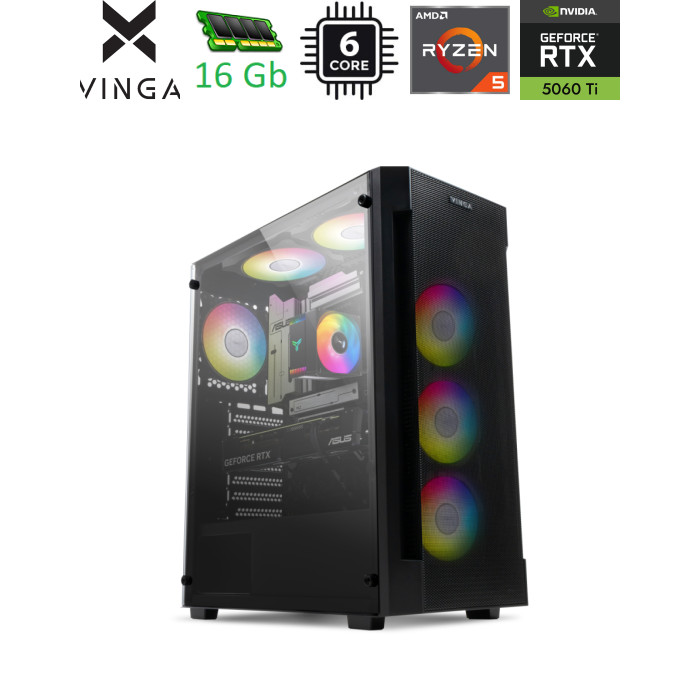 Компьютер Vinga Rhino D9104, с операционной системой Windows 11 Home, объединяет преимущества игровой платформы и современной рабочей станции. Это оптимальный вариант для большинства актуальных игр на средних и высоких настройках графики, а также повседневных и рабочих задач. Процессор AMD Ryzen 5 8400F В аппаратную конфигурацию компьютера Vinga Rhino D9104 входит 6-ядерный процессор AMD Ryzen 5 8400F микроархитектуры Zen 4, изготовленный по 4-нм техпроцессу. Базовая тактовая частота камня составляет 4,2 ГГц. Чтобы вычислительной мощности хватило для решения наиболее ресурсоемких задач, предусмотрена технология Precision Boost, которая автоматически повышает частоту до 4,7 ГГц. На быстродействие системы влияет объем кэш-памяти CPU — чем больше кэша, тем больше копий данных из оперативной памяти в нем может храниться. Поэтому часто используемые приложения, браузеры и игры запускаются практически моментально. Ryzen 5 8400F получил 16 МБ кэш-памяти третьего уровня. Все процессоры AMD Ryzen 5000 Series поставляются с полным набором технологий, предназначенных для повышения вычислительной мощности вашего ПК, включая Precision Boost 2, Precision Boost Overdrive и PCIe 4.0. Расчетная тепловая мощность заявлена на уровне 65 Вт. Этот процессор прекрасно подходит для решения повседневных задач, работы в многозадачном режиме и гейминга! Игровая видеокарта GeForce RTX 5060 Ti Vinga Rhino D9104 гарантирует хорошее изображение как в играх, так и при просмотре видео. Это заслуга видеокарты GeForce RTX 5060 Ti, которая вышла в 2025 году. RTX 5060 Ti – это передовой графический ускоритель, созданный на базе архитектуры NVIDIA Blackwell. Инновационные RT-ядра четвертого поколения и мощные тензорные ядра пятого поколения обеспечивают прорывные возможности нейронного рендеринга и максимальную производительность в самых требовательных задачах. В видеокарте GeForce RTX 5060 Ti благодаря новой микроархитектуре внедрены элементы машинного обучения. В частности, технология NVIDIA DLSS 4 обеспечивает исключительное качество сглаживания и улучшает производительность. В результате вы сможете наслаждаться воспроизведением видео в формате 4K с частотой обновления до 480 Гц или 8K с частотой 165 Гц благодаря поддержке DSC (Display Stream Compression). Основные характеристики дискретной карты GeForce RTX 5060 Ti: