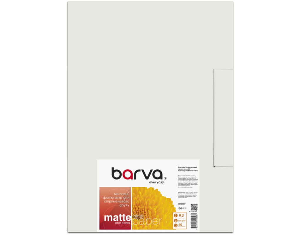 | Самостійний на друк на струменевих принтерах чи БФП в домашніх умовах або в офісі дає можливість швидко створювати широкий спектр документів або друкувати фото. Для того щоб цей процес приносив виключно позитивні емоції дуже важливо обрати якісний носій для друку. При цьому бажано щоб вартість такого носія була доступною і не обмежувала Вас. Під торговою маркою Barva на ринок виходить широкий асортимент матеріалів для струменевого друку, який допоможе Вам з виконанням різних завдань - від друку фотографій, до виготовлення рекламних і маркетингових матеріалів. Носії для струминного друку під цією торговою маркою випускаються на ринок українською компанією ТОВ «В. М. » з 2003 року і вже встигли завоювати довіру користувачів незмінно високою якістю та доступними цінами. Фотопапір матовий 220 г/м2, A3, 20 арк Everyday Barva (IP-AE220-382) принтерами та БФП можна використовувати? Паперова продукція Barva показує відмінні результати друку з усіма струминними пристроями, представленими на ринку. Здійснюючи вибір, зверніть увагу на рекомендації виробника техніки щодо формату та максимальній щільності фотопаперу для Вашої моделі. Для досягнення оптимального результату по передачі кольору і світлостійкості ми рекомендуємо використовувати комбінацію - Фотопапір Barva + чорнило Barva. На що потрібно звернути увагу при виборі: Як правильно обрати відповідну щільність фотопаперу? Щільність фотопаперу зазвичай вимірюється в грамах на квадратний метр і обов'язково вказується виробником в назві товару та на упаковці. Щільність впливає на такі параметри відбитка: Потрібно також враховувати, що зі збільшенням щільності зростає і вартість паперу. Перед тим як обрати необхідну саме Вам щільність, потрібно визначитися з основними завданнями. Наші рекомендації наступні: Зображення, надруковані на матовому носії, відрізняються високою контрастністю і деталізацією зображення, глибиною і шовковистістю кольорів. Також серед переваг даного типу паперу можна виділити: Основні сфери застосування матового паперу: Матовий папір низької щільності може бути використаний для сублімації. Серія паперу Barva Everyday Ідеальний варіант для економного користувача, який цінує співвідношення ціна-якість. Сировина для фотопаперу даної серії випускається в Китаї і проходить ретельний контроль якості. Основні особливості серії Barva Everyday: Фотопапір А3 формату Потрібно враховувати, що Ваш принтер чи БФП повинен бути призначений для роботи з носіями даного формату. Розмір листа - 297 × 420 мм. Рекомендуємо обрати даний формат паперу для друку наступних типів документів: Тип покриття;Щільність;Формат та розмір;Світлостійкість і передача кольору; довговічність;поглинання чорниламожливість деформації носія. Друк офісних документів - 80 г/м2;Друк презентацій, діаграм, постерів - 90 - 120 г/м2;Друк картинок - більше 90 г/м2;Друк фотографій - більше 120 г/м2;Друк професійних фотографій - більше 180 г/м2. Наявність широкого асортименту по щільності - від 90 г/м2 до 230 г/м2Універсальність застосування від простих завдань до професійного фото;Більш низька вартість в порівнянні з глянцевим;Не залишаються відбитки пальців, на відміну від глянця;Відсутні будь-які бликі. Друк документів - презентацій, діаграм;Друк фотографій;Друк графіки, ілюстрацій;Виготовлення рекламної продукції. Оптимальне співвідношення ціна-я