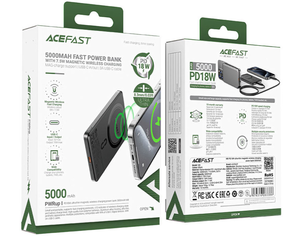| УМБ Acefast Magnetic Wireless 5000mAh 18W PD,QC 3.0, QI 7.5 Вт, ультра тонкий, M8 Black |