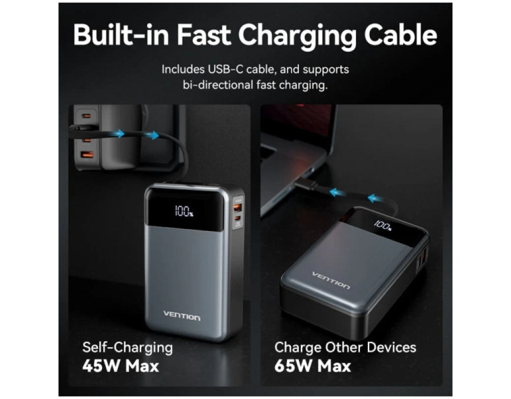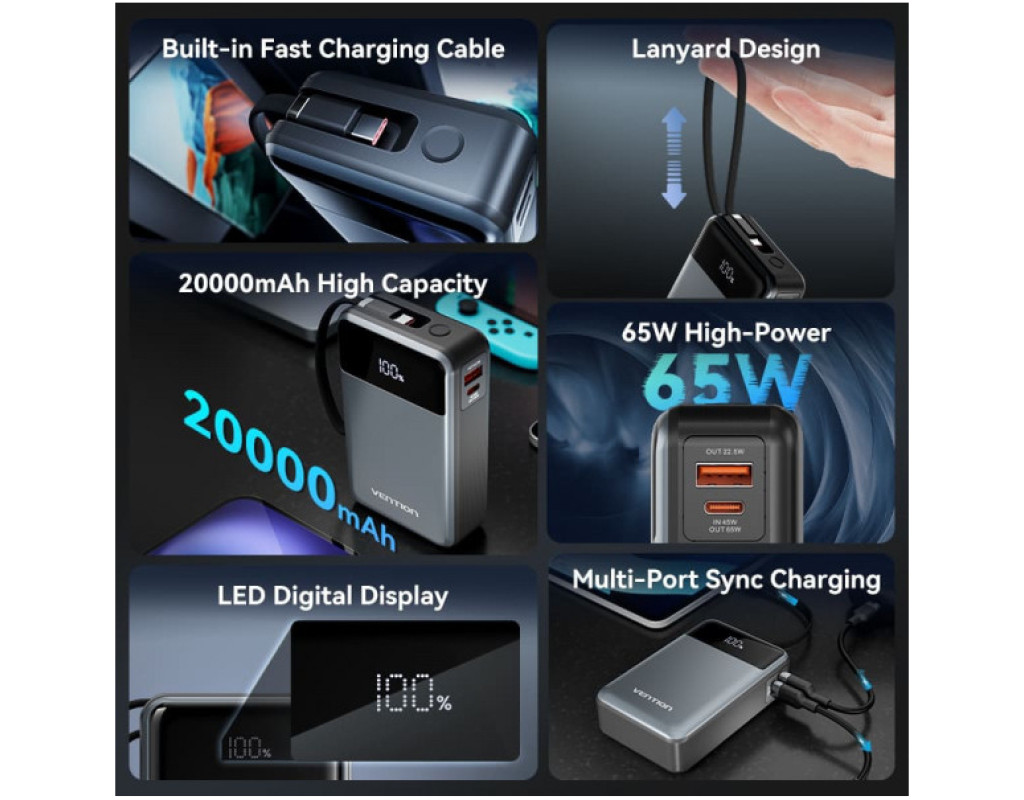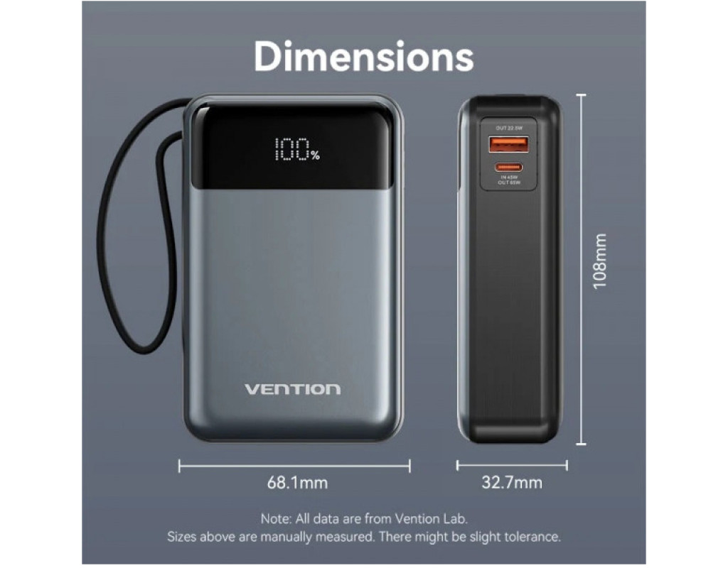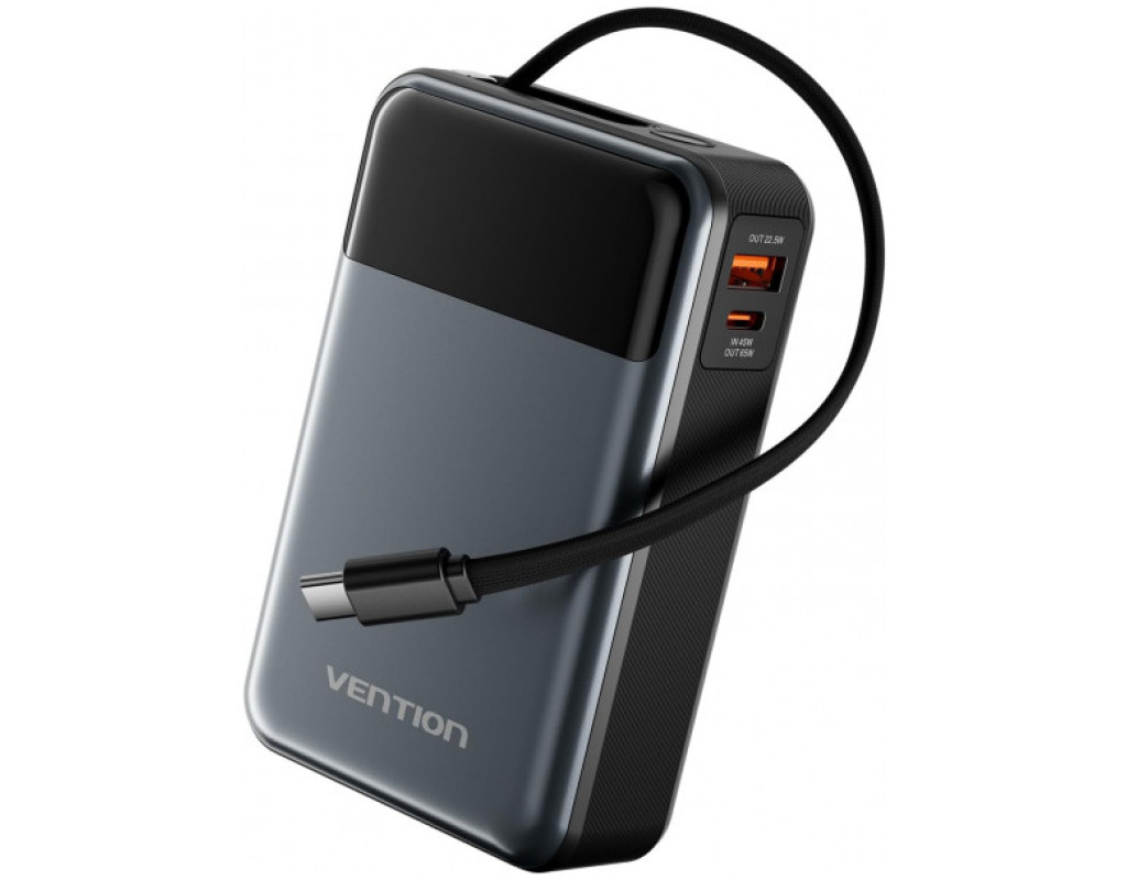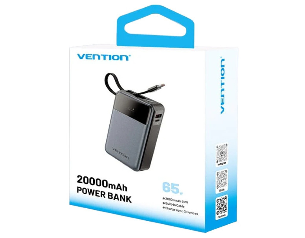 Универсальная мобильная батарея емкостью 20000 мАч Vention 20000mAh 65W (FHYB0) поможет быстро и безопасно зарядить смартфоны, планшеты, ноутбуки, аккумуляторы настольных ламп, вентиляторов и другие USB-устройства. Повербанк Vention 20000mAh 65W оснащен выходными портами USB-C и USB-A и встроенным кабелем USB-C. Вы сможете пополнять заряд одновременно трех устройств с мощностью до 15 Вт. При зарядке одного устройства порт USB-A поддерживает зарядную мощность до 22,5 Вт, порт USB-C и кабель USB-C – до 65 Вт. При пополнении заряда УМБ порт USB-C и USB-C кабель будут работать с мощностью до 45 Вт. Цифровой дисплей на передней панели батареи будет сообщать о текущем уровне заряда батареи. Встроенная защита от перегрузки по току, перенапряжению, перезарядке, переразрядке, перегреву и короткому замыканию делает батарею Vention 20000mAh 65W безопасной для вас и ваших устройств. Выполненная в алюминиевом корпусе УМБ Vention 20000mAh 65W станет вашим идеальным спутником для путешествий. Берите ее на борт самолета и поддерживайте заряд своих портативных устройств. |