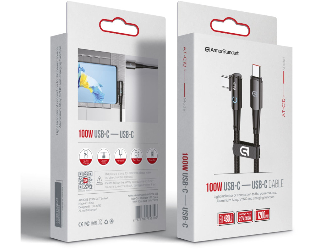 Дата кабель USB-C to USB-C 1.2m 90-degree 100W black Armorstandart (ARM75870)