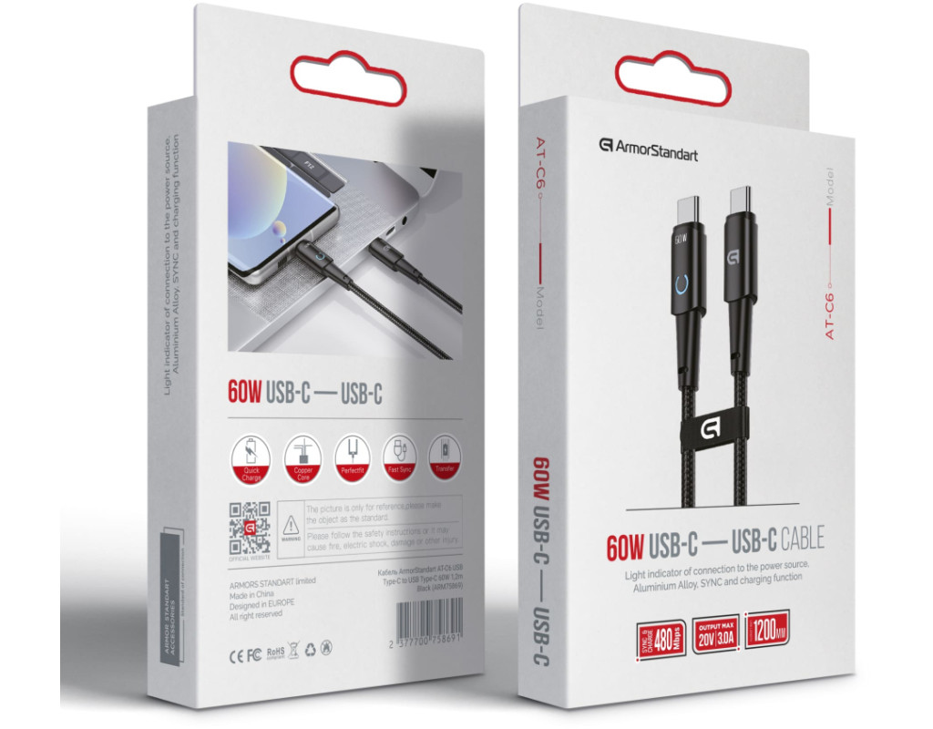 Дата кабель USB-C to USB-C 1.2m 60W black Armorstandart (ARM75869)