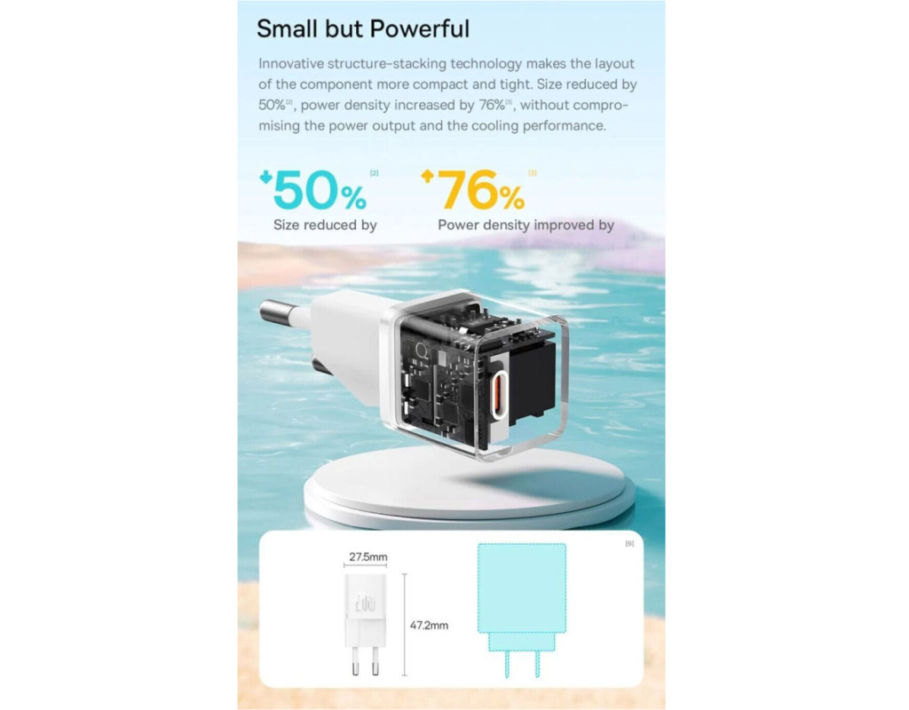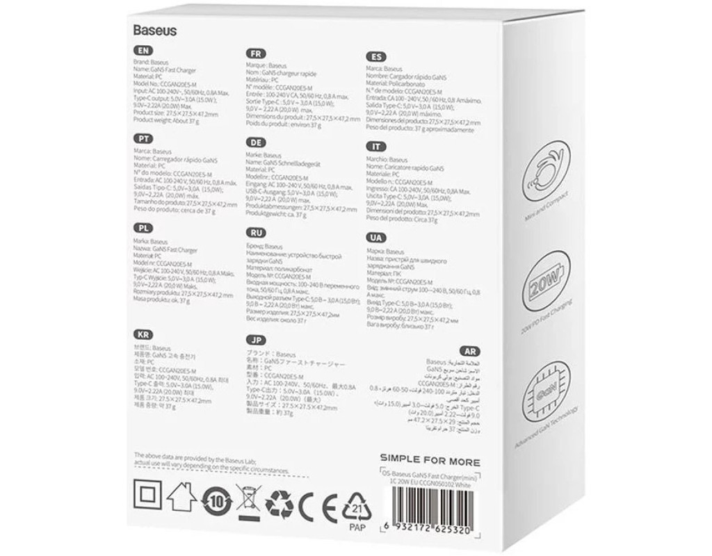 | Зарядное устройство Baseus GaN5 Fast Charger USB-C 20W white (CCGN050102) предлагает высокотехнологичный подход к зарядке ваших устройств. Используя инновационную технологию GaN5, этот адаптер обеспечивает высокую эффективность и компактность благодаря нитриду галлия, который является новым типом полупроводника. Это позволяет уменьшить количество компонентов, сохраняя удобный размер и лёгкость устройства. С мощностью 20 Вт и поддержкой быстрых стандартов зарядки, таких как Power Delivery 3.0 и Quick Charge 3.0, Baseus GaN5 гарантирует молниеносную зарядку для всех ваших гаджетов, включая телефоны, планшеты, наушники TWS и даже смарт-часы. Зарядное устройство рассчитано на работу при напряжении 100-240 В и частоте 50-60 Гц, что делает его идеальным помощником для путешествий по всему миру. Компактный корпус данного адаптера изготовлен из огнеупорного полимера, что обеспечивает его прочность и надёжность, а также термостойкость, поддерживая стабильную рабочую температуру. Инновационная технология BCT способствует рассеиванию тепла, что делает это устройство безопасным в эксплуатации. Эргономичность и удобство использования этого зарядного устройства подчёркивается компактным размером, лёгкостью (всего 37 г) и универсальностью одного выхода USB Type-C, который поддерживает широкий круг зарядных кабелей. Встроенная интеллектуальная система управления оптимизирует процесс зарядки, защищает от перезарядки и перегрева, что делает это зарядное устройство надёжным решением для ежедневного использования. Совместимость с современными протоколами ускорения зарядки гарантирует, что ваши устройства всегда будут в рабочем состоянии. |