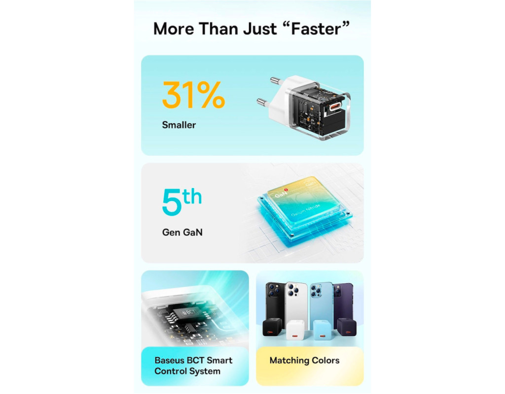 | Зарядное устройство Baseus GaN5 Fast Charger USB-C 30W black (CCGN070401): Комбинация инноваций и удобства в вашей руке Превосходите свои ожидания от зарядки с новейшей разработкой от Baseus — GaN5 Fast Charger, который сочетает в себе мощность и портативность благодаря передовому материалу GaN (нитрид галлия). Этот зарядный адаптер, по сравнению с традиционными моделями, обеспечивает значительно меньшие габариты без компромиссов по производительности, позволяя своему владельцу заряжать всё — от смартфонов, планшетов до смарт-часов и экшн-камер. Основной фишкой этого зарядного устройства является поддержка технологий Power Delivery 3.0 и Quick Charge 3.0, которые минимизируют время зарядки, гарантируя безопасность и стабильность тока. С максимальным выходным током в 3 А и мощностью 30 Вт, это устройство обеспечивает феноменальную скорость зарядки и сохраняет энергоэффективность. Универсальный USB Type-C порт превращает процесс подключения в простую задачу, и при этом устройство может использоваться для зарядки не только смартфонов, но и TWS наушников, фитнес-браслетов, раций и геймпадов. Стиль, подчеркнутый элегантным черным цветом, делает это зарядное устройство незаменимым аксессуаром, удовлетворяющим ваши эстетические потребности. Какова бы ни была ваша цель, будь то работа в офисе или отдых в путешествии, Baseus GaN5 не оставит вас без надежного источника энергии. Качество — это основа успеха Baseus. У вас будет 12-месячная гарантия на этот продукт, что подчеркивает его надежность и долговечность. Ощутите все преимущества Baseus GaN5 Fast Charger в вашей повседневной жизни и наслаждайтесь непрерывной продуктивностью и скоростью. |