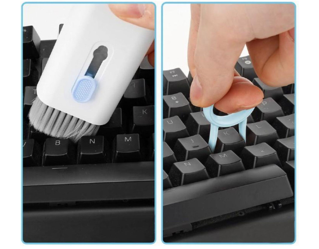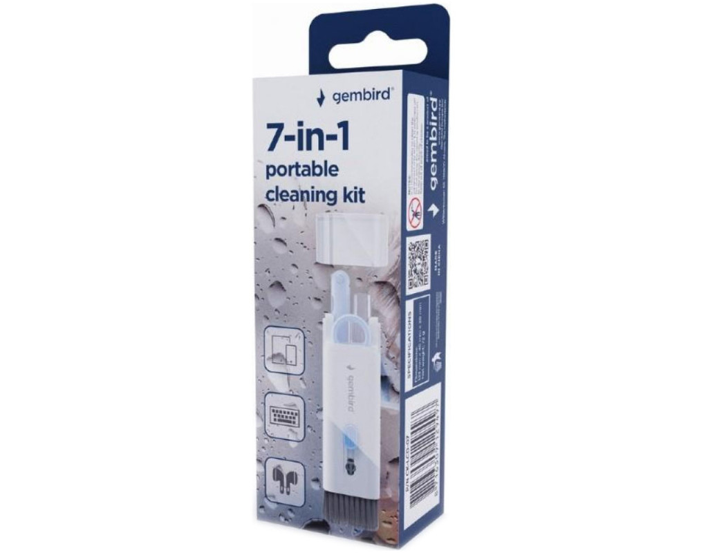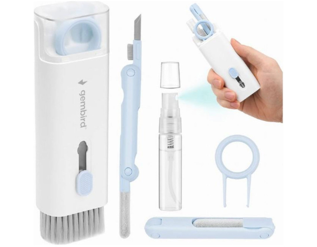 - До комплекту входить пляшка з очисним спреєм, серветка з мікрофібри, пулер для клавіш клавіатури, висувна щітка і спеціальний інструмент для чищення навушників
