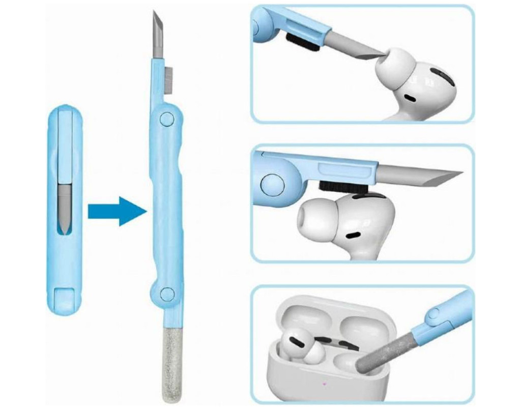 - Практичний складний інструмент для чищення навушників оснащений силіконовим наконечником, м'якою флокованою губкою та щіточкою