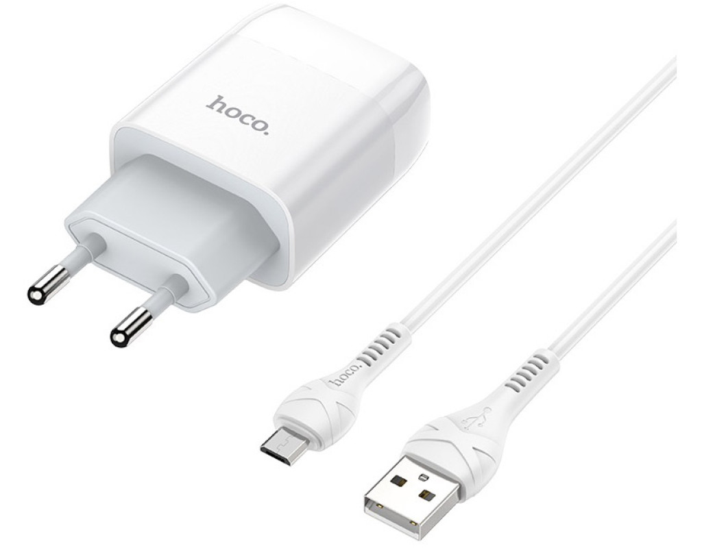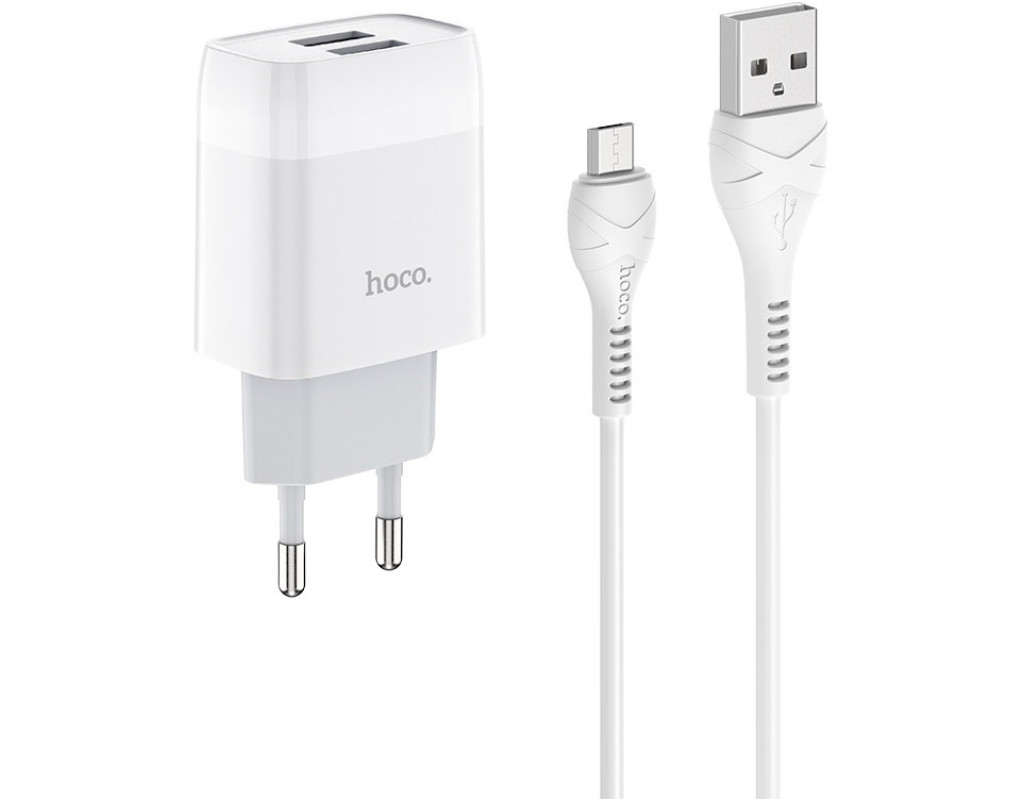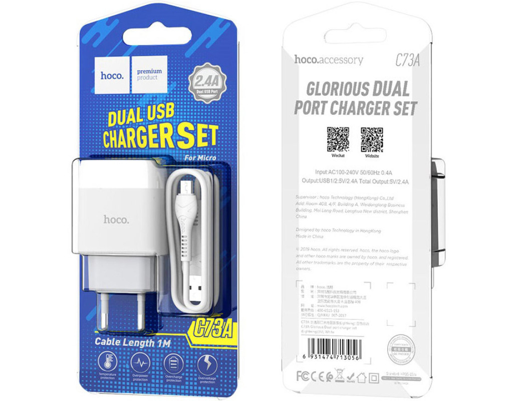 Hoco C73A Glorious dual port charger set (Micro) White – комплект из зарядного устройства с двумя USB-портами и кабелем USB – Micro-USB. Он поможет быстро и безопасно зарядить телефон, планшет, наушники за короткий промежуток времени. Зарядное устройство имеет стильный и эргономичный дизайн, внешний корпус изготовлен из огнеупорного поликарбоната, устойчив к высоким температурам и внешним повреждениям. Подключение к центральной сети осуществляется с помощью евровилки, поддерживается напряжение на входе от 110 до 220 В. Внутри зарядного устройства предусмотрена защита от скачков электричества, перегрева и других неприятностей, что делает его использование безопасным. Особенности: