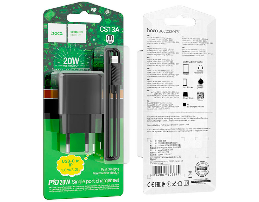 | Зарядное устройство HOCO CS13A Ocean USB-C PD20W в черном цвете — это инновационное решение для быстрой и надежной зарядки ваших гаджетов. Оснащенный передовыми технологиями Quick Charge 3.0, Power Delivery и Programmable PowerSupply (PPS), это устройство обеспечивает до 20 Вт мощности, гарантируя впечатляющую скорость зарядки. Благодаря максимальному выходному току в 3 А, оно подходит для широкого спектра устройств, включая смартфоны, рации, смарт-часы, TWS наушники, планшеты, геймпады, экшн-камеры и фитнес-браслеты. HOCO CS13A Ocean имеет единственный порт USB Type-C, что делает его совместимым с современными устройствами и обеспечивает эффективный и стабильный энергообмен. В комплекте идет прочный кабель USB-C to Lightning длиной 1 метр, что идеально подходит для владельцев техники Apple. Он не только обеспечивает надежную передачу энергии, но и подчеркивает универсальность этого зарядного устройства. Устройство изготовлено с использованием высококачественных материалов, что гарантирует его долговечность и надежность. Особое внимание уделено безопасности: зарядное устройство оснащено системой защиты от перегрева и короткого замыкания, что обеспечивает безопасное использование без риска повреждения устройств. Компактный дизайн делает HOCO CS13A Ocean идеальным выбором для путешествий, рабочего окружения или домашнего использования. Легкий и удобный, он всегда готов обеспечить вашу технику энергией, где бы вы ни находились. Выбрав это зарядное устройство, вы получите исключительное качество, современные технологии и комфорт в каждой детали. |