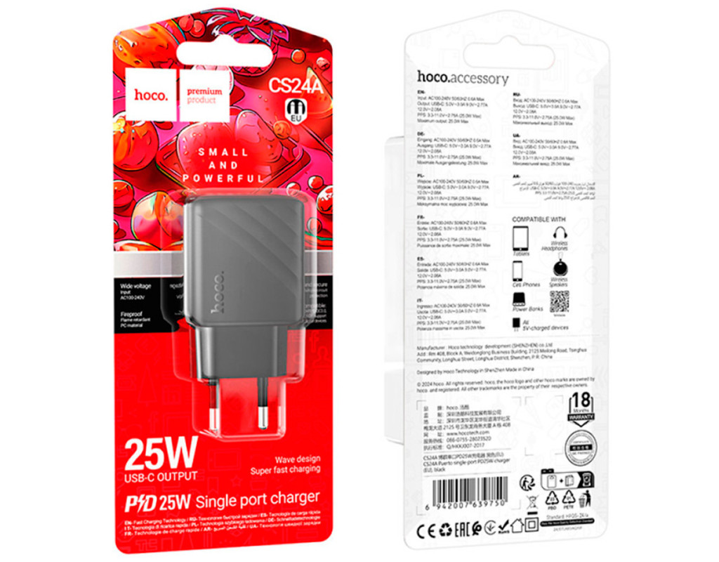 Сетевое зарядное устройство Hoco CS24A Puerto оснащено портом Type-C для эффективной зарядки ваших девайсов. Он совместим со многими современными устройствами: повербанками, смартфонами, планшетами, акустическими системами разных производителей. Максимальная выходная мощность адаптера составляет 25 Вт. Имеется поддержка протоколов быстрой зарядки PD25W, QC, FCP, AFC. Корпус выполнен из качественного ABS-пластика. Компактный размер (82.2 х 44 х 27.5 мм) гарантирует, что зарядное устройство будет вашим надежным спутником в любом путешествии, обеспечивая быструю и эффективную зарядку ваших любимых гаджетов, где бы вы ни находились. Высококачественные материалы и производственные стандарты обеспечивают долговечность и надежность зарядного устройства. |