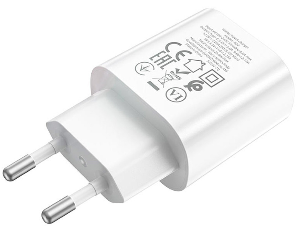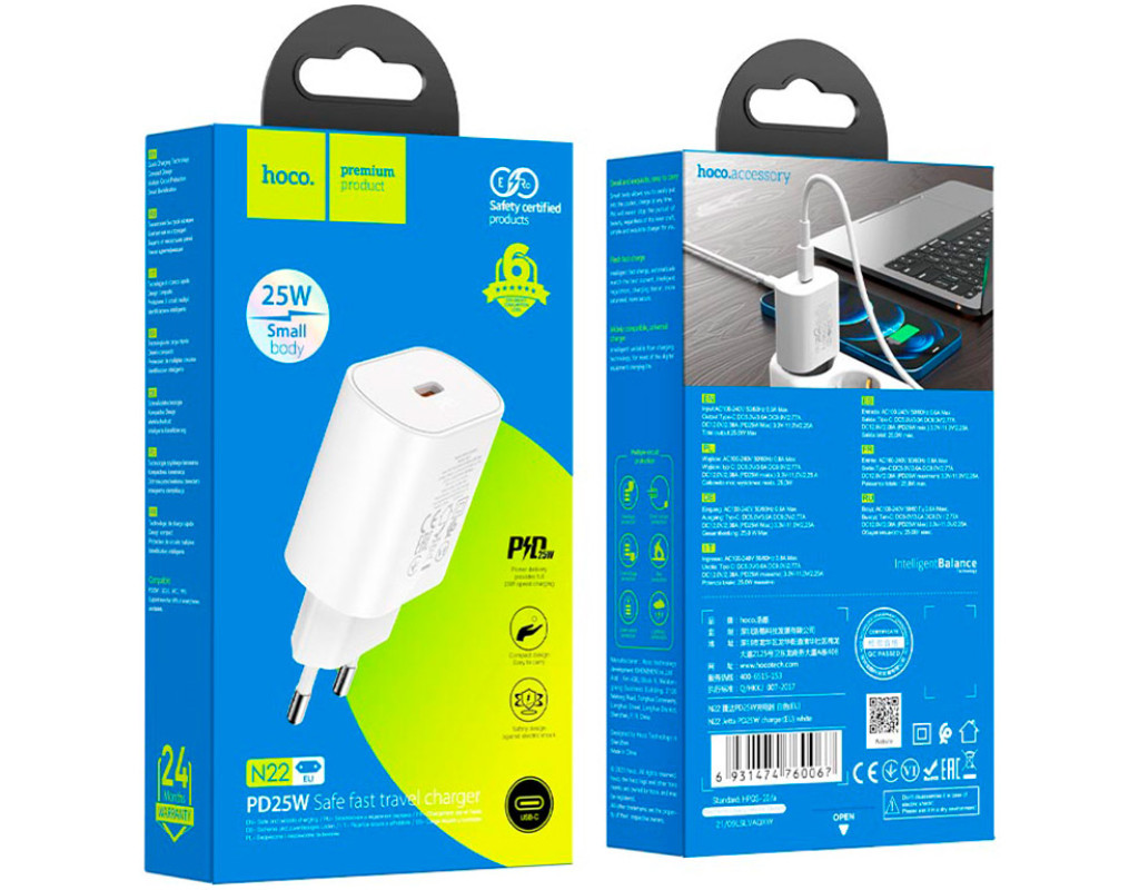 Сетевое зарядное устройство Hoco N22 Jetta PD25W charger White – современный, выполненный в классическом дизайне адаптер созданный для качественной зарядки смартфонов и планшетов. Модель отличается стильным внешним видом и компактными размерами, что определяет комфортную повседневную эксплуатацию. Ее исключительная надежность и долговечность гарантируют стабильность процесса зарядки и минимизируют возможные повреждения, вызванные перегревом, короткими замыканиями, скачками напряжения и перегрузкой. Корпус аксессуара изготовлен из стойкого к ударам и открытого огня поликарбоната, выполнен с закругленными боковыми гранями и приятной на ощупь глянцевой поверхностью. Устройство оснащено одним разъемом Type-C, расположенным в торце, оно может использоваться для зарядки совместимых гаджетов по протоколам PPS, QC 3.0/2.0, AFC и PD с максимальной мощностью на выходе 25 Вт. |