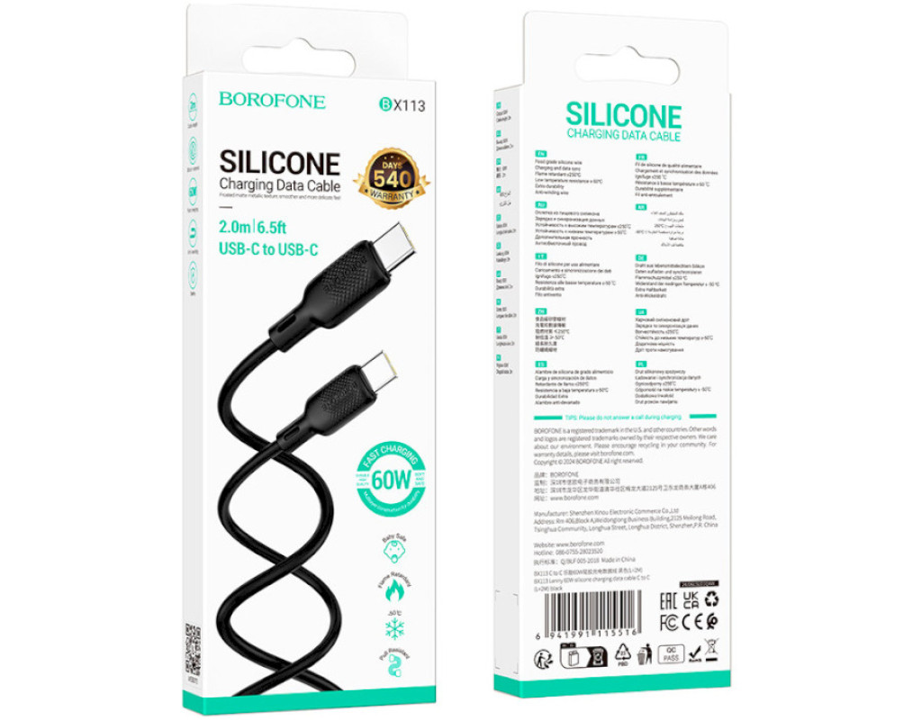 Дата кабель USB-C to USB-C 2.0m 60W Lenny silicone BX113 black BOROFONE (6941991115516)