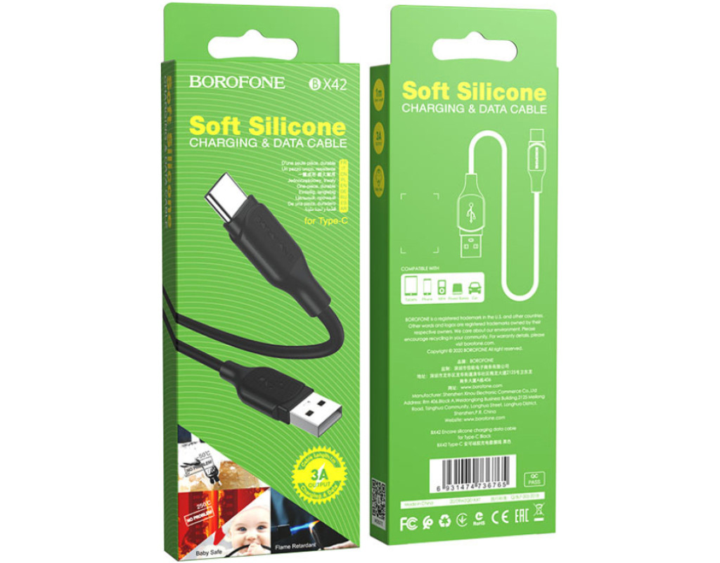 Дата кабель USB 2.0 AM to USB-C 1.0m 3A silicone BX42 black BOROFONE (6931474736765)