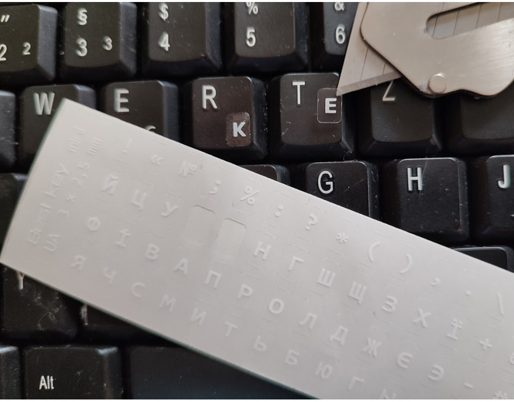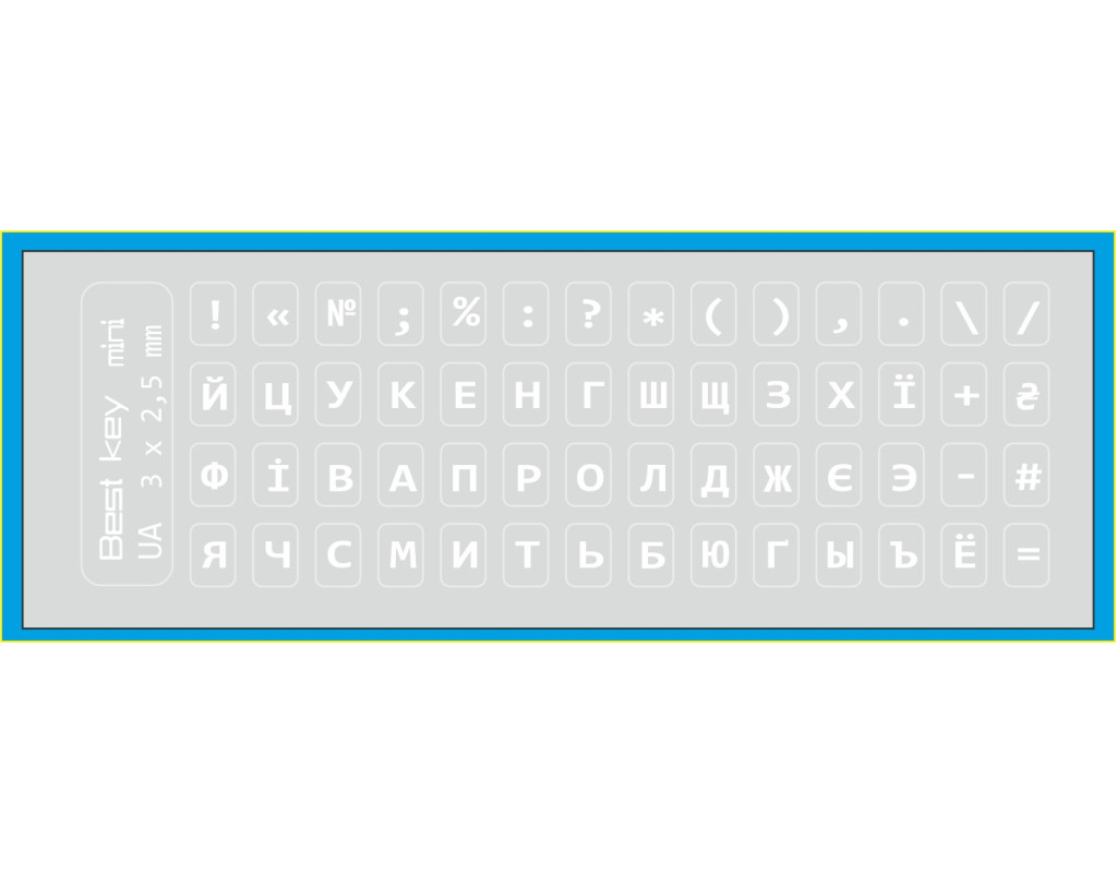 Наклейка на клавиатуру Best key mini 3х2,5мм. Наклейка на клавиатуру универсальная прозрачная белыми буквами. Изготовлена по технологии, которая обеспечивает не стирание букв. Основа матовая прозрачная 5х6 мм. Хорошо подходит для клавиатур с подсветкой. На наклейке 56 клавиш изготовленых из мягкой ПВХ пленки. Размер букв 3х2,5 мм. |