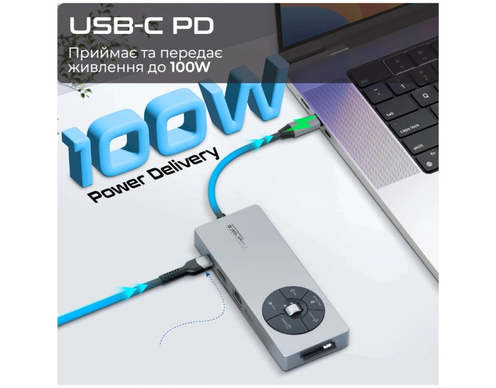 - USB Type-C PD: Благодаря технологии Power Delivery, хаб способен принимать и передавать питание от источника на мощности до 100 Вт.