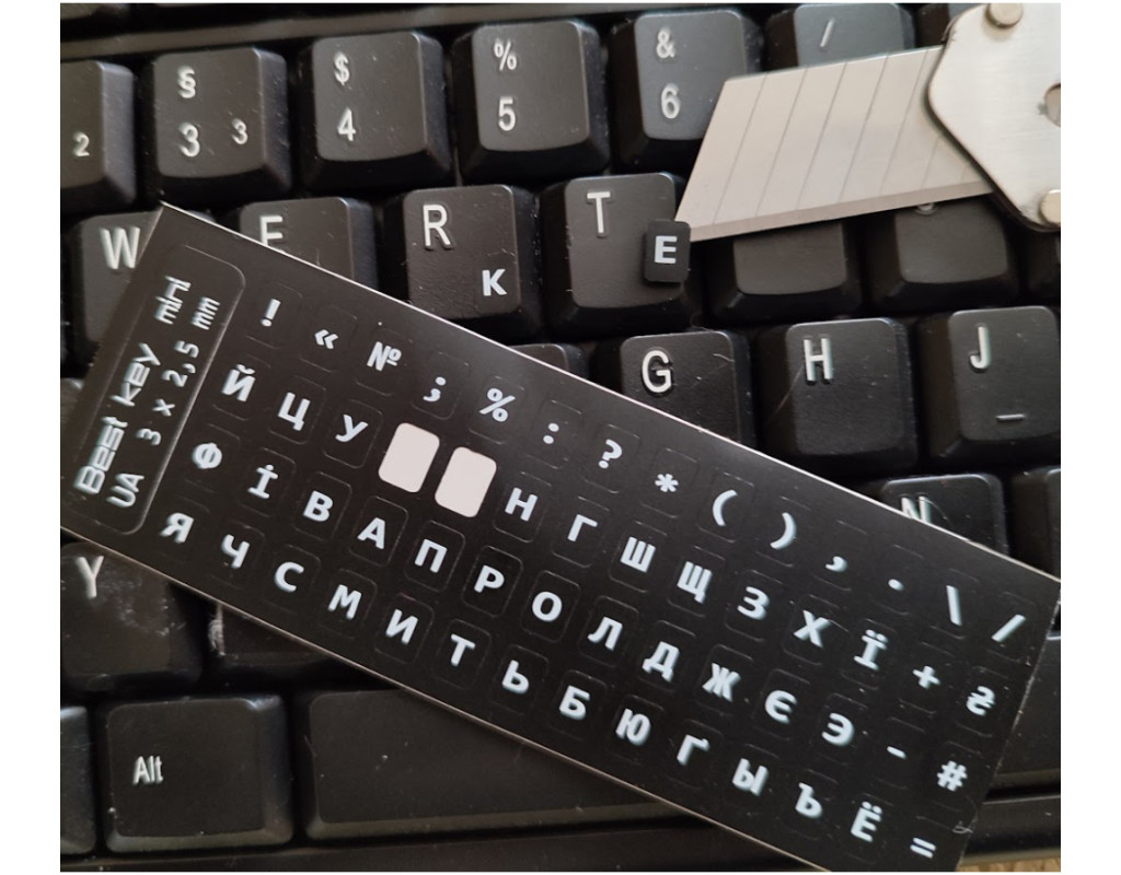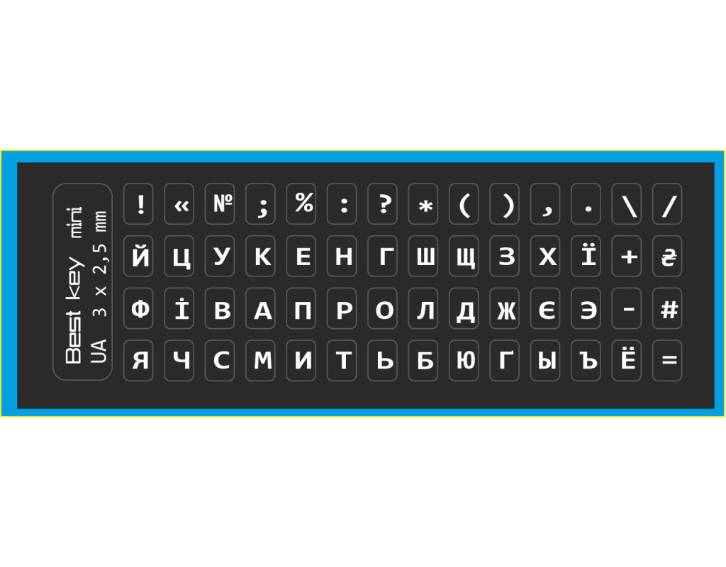 Наклейка на клавиатуру Best key mini 3х2,5мм. Наклейка на клавиатуру универсальная непрозрачная белыми буквамими. Изготовлена по технологии, которая обеспечивает не стирание букв. Основа матовая чорная не прозрачная 5х6 мм. Хорошо подходит для клавиатур с подсветкой. На наклейке 56 клавиш изготовленых из мягкой ПВХ пленки. Размер букв 3х2,5 мм. |