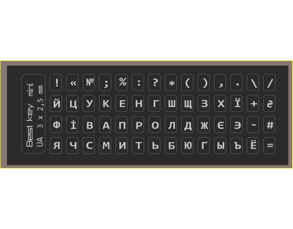 Наклейка на клавиатуру Best key mini 3х2,5мм. Наклейка на клавиатуру универсальная не прозрачная серебряными буквамими. Изготовлена по технологии, которая обеспечивает не стирание букв. Основа матовая чорная не прозрачная 5х6 мм. Хорошо подходит для клавиатур с подсветкой. На наклейке 56 клавиш изготовленых из мягкой ПВХ пленки. Размер букв 3х2,5 мм. |