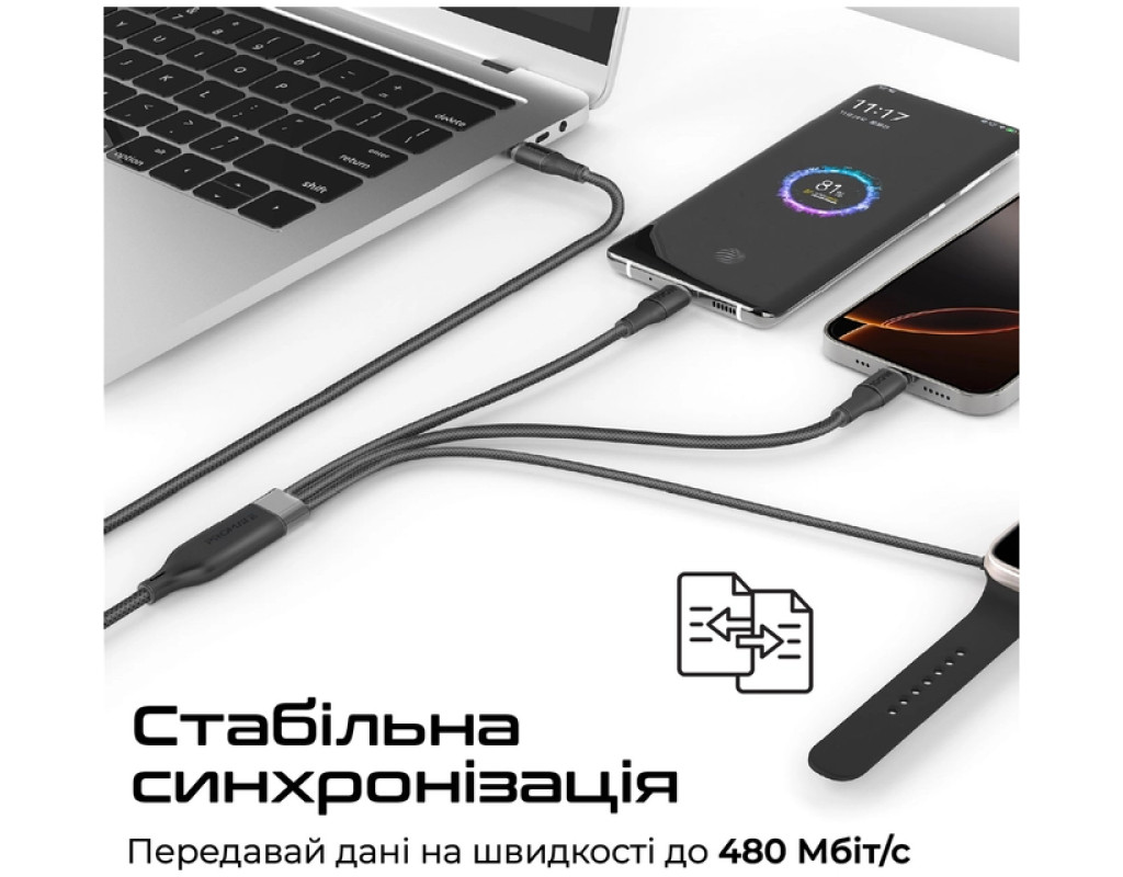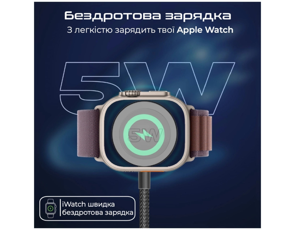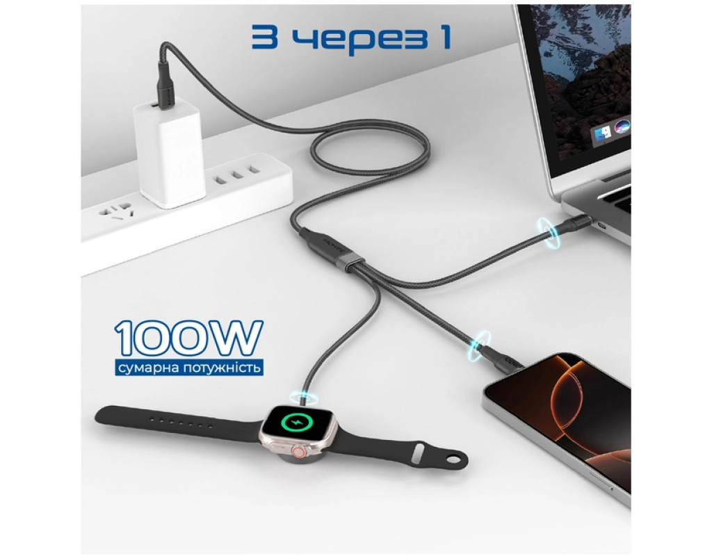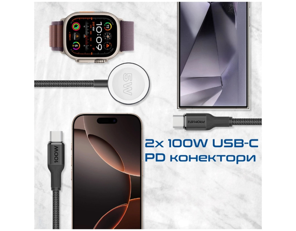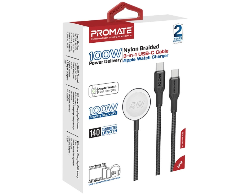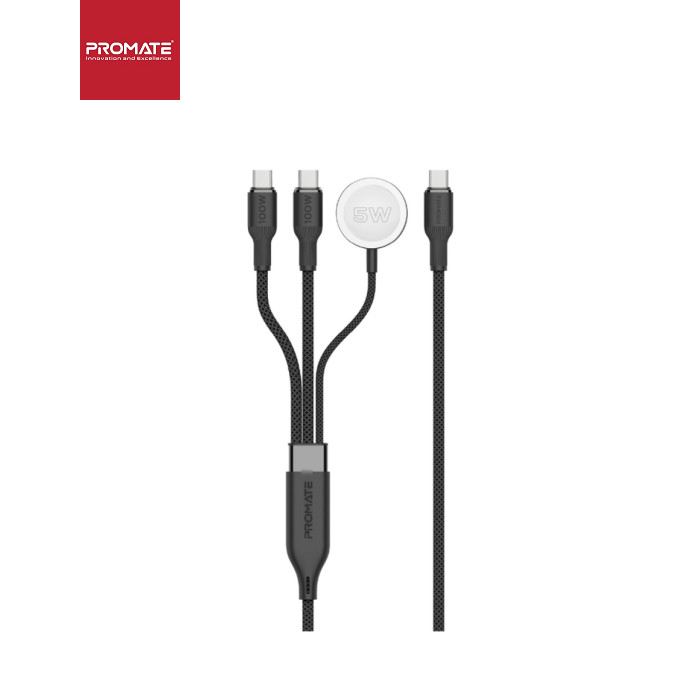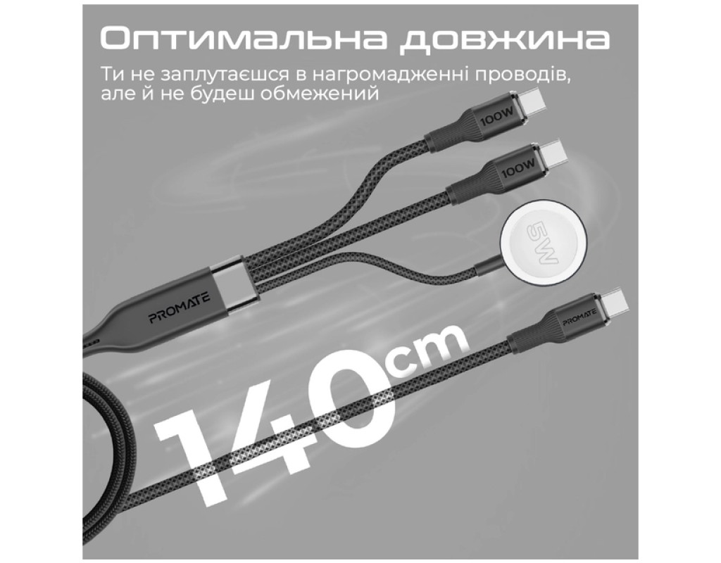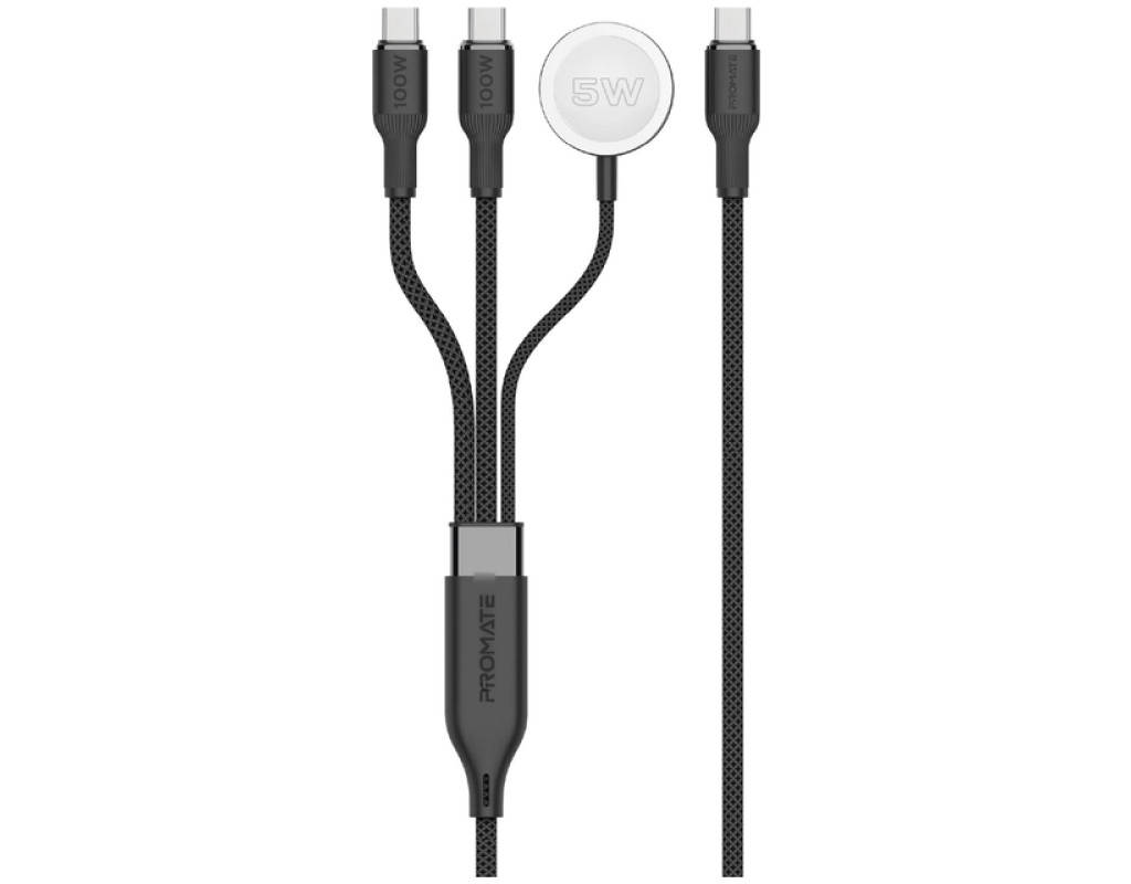 Дата кабель USB-C to 2xUSB-C 100W + Apple Watch 5W 1.4m FUSION-CCW black Promate (fusion-ccw.black)