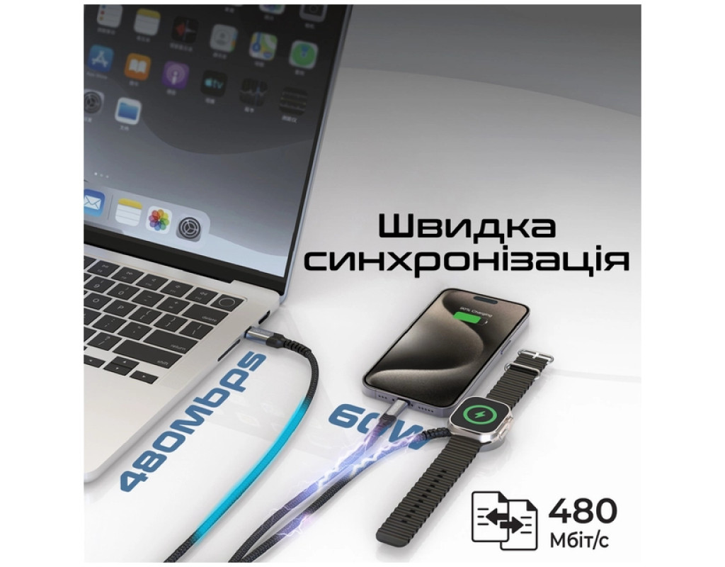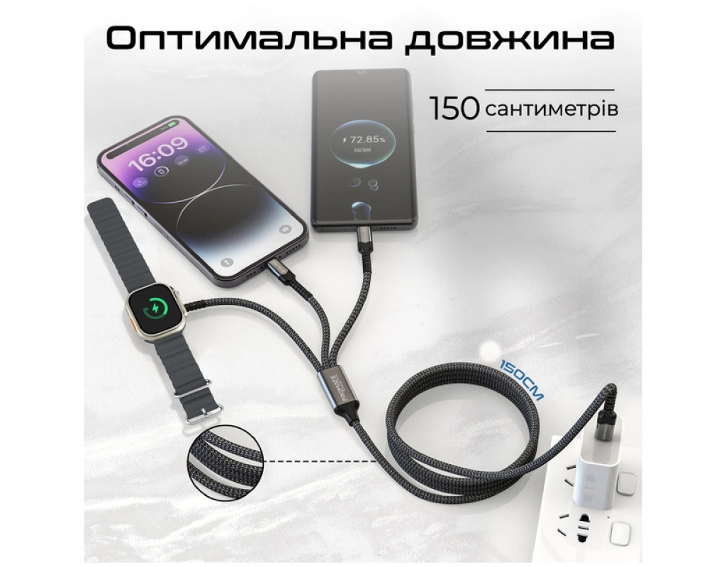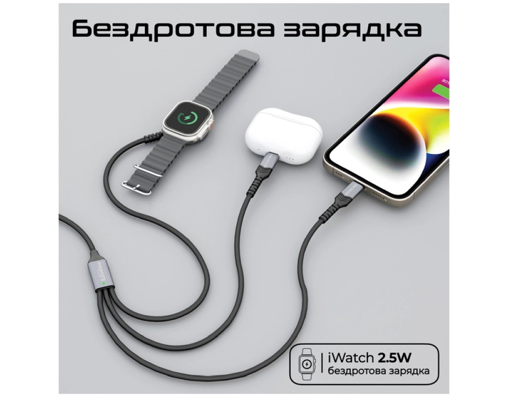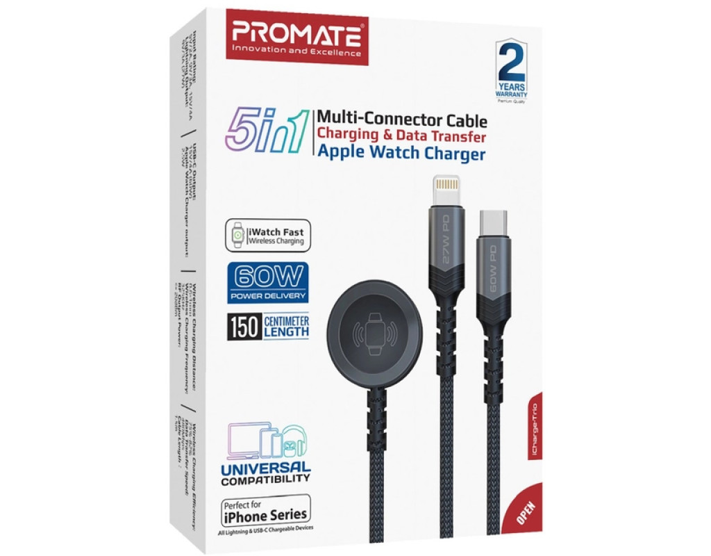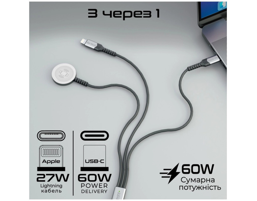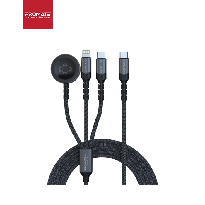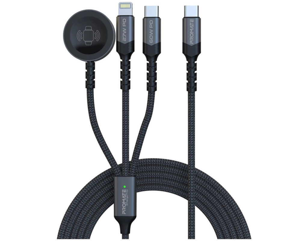 Дата кабель USB-C to Lightning 27W + USB-C 60W + Apple Watch 2.5W 1.5m icharge trio black Promate (icharge-trio.black)
