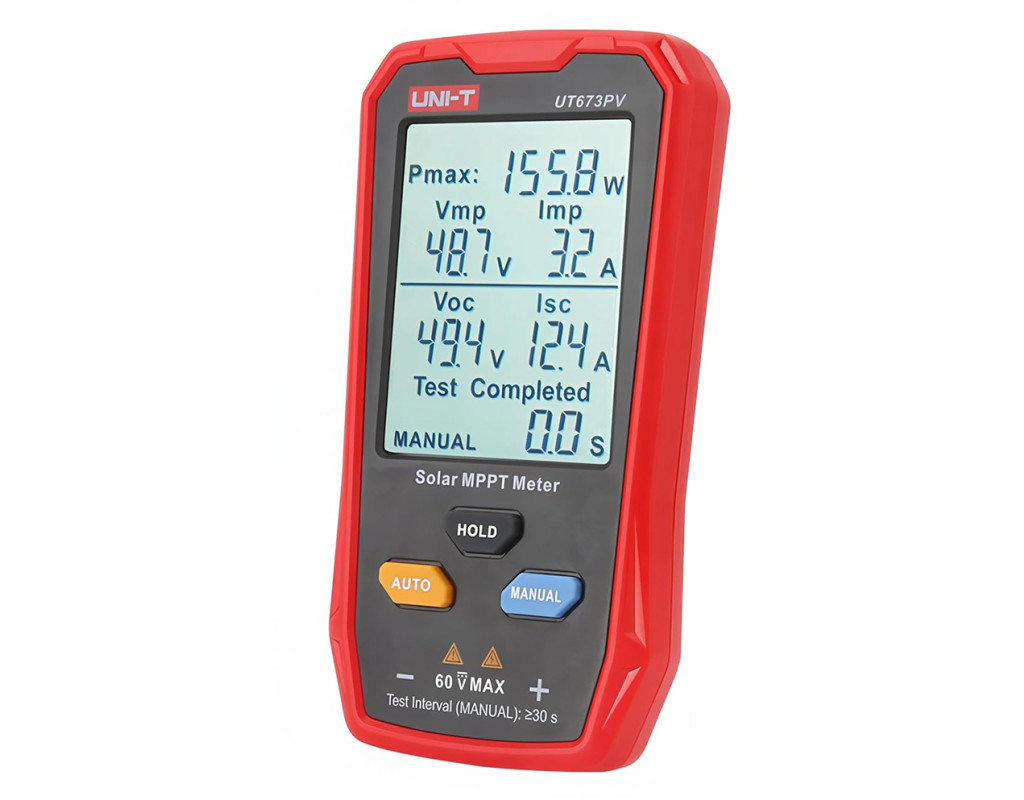 | Тестер параметрів сонячних панелей UNI-T UT673PV – це професійний вимірювальний прилад, розроблений спеціально для тестування фотоелектричних модулів у галузі сонячної енергетики. Основне завдання - визначення точки максимальної потужності (MPPT), що є ключовим параметром для аналізу ефективності сонячної панелі. Прилад одночасно вимірює та відображає п`ять основних параметрів: максимальну потужність (Pmax), напругу в точці максимальної потужності (Vmp), струм у цій точці (Imp), напругу холостого ходу (Voc) та струм короткого замикання (Isc). Це дозволяє оперативно виявляти несправності, визначати втрати потужності чи контролювати якість продукції будь-якому етапі — від виробництва до обслуговування. Пристрій живиться від сонячної панелі і не вимагає батарей. Підтримуються ручний та автоматичний режими тестування, а також реалізовані всі основні види захисту від перевантаження, перегріву, зворотної полярності. Великий дисплей та інтуїтивне керування роблять прилад зручним для використання як у лабораторії, так і безпосередньо на об`єкті. Характеристики: • Максимальна потужність (Pmax): 5-800 Вт • Напруга максимальної потужності (Vmp): 12-60 В • Струм точки максимальної потужності (Imp): 0-35 А • Напруга холостого ходу (Voc): 12-60 В • Струм короткого замикання (Isc): 0-35 А • Дисплей: великий LCD 52×66 мм • Режими роботи: автоматичний / ручний • Інтерфейс підключення: стандартний MC4 • Захист: від перегріву, струму, напруги, зворотної полярності • Функція HOLD: є • Живлення: від сонячної панелі • Вага: 155 г • Габарити: 142×76×22 мм Тестер параметрів сонячних панелей UNI-T UT673PV ідеально підходить для перевірки сонячних модулів на виробництві, приймального контролю на об`єктах, монтажу та діагностики сонячних електростанцій, а також обслуговування та планового технічного огляду фотомодулів. Комплектація включає тестовий кабель з роз`ємами MC4, інструмент для демонтажу конекторів, захисний чохол та посібник користувача. |