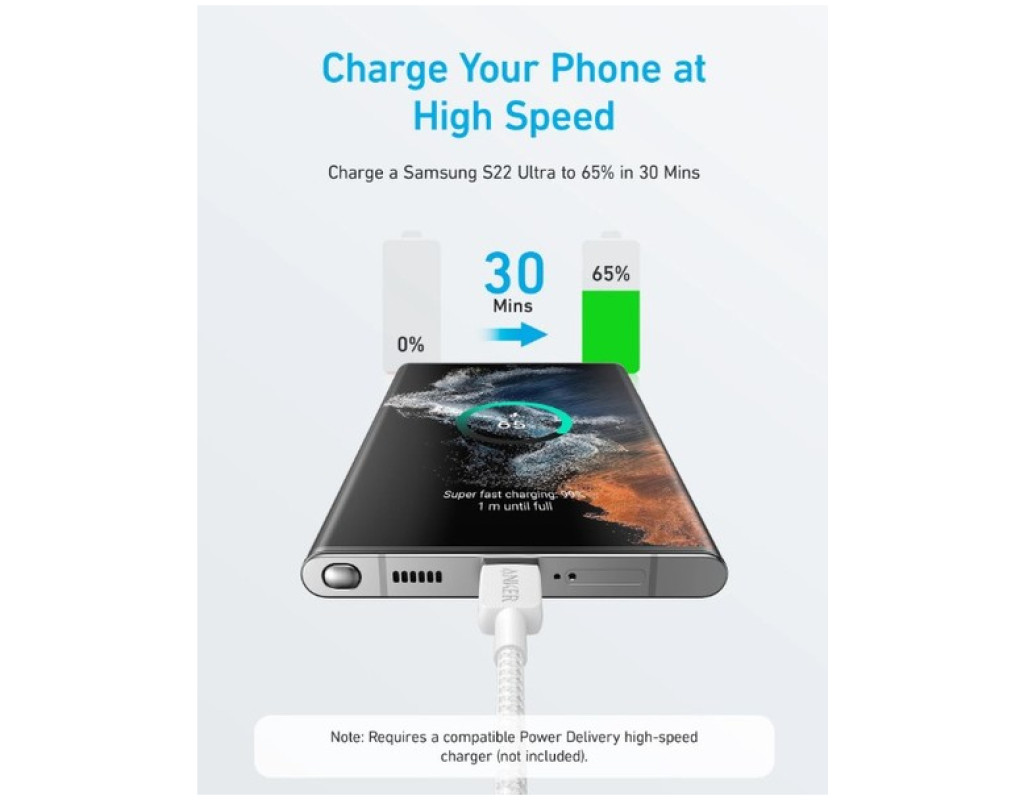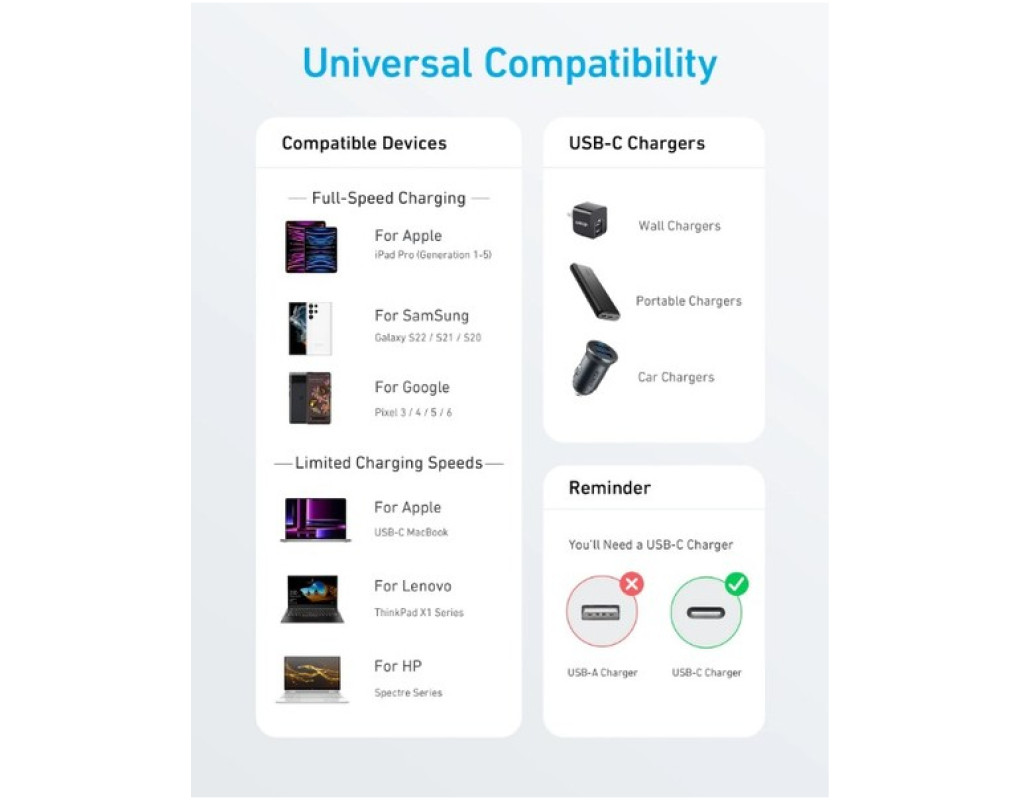 Поддерживает максимальную выходную мощность 60 Вт или более для питания практически любого устройства USB-C, включая телефоны, планшеты и ноутбуки (при условии использования зарядного устройства на 60 Вт или более)