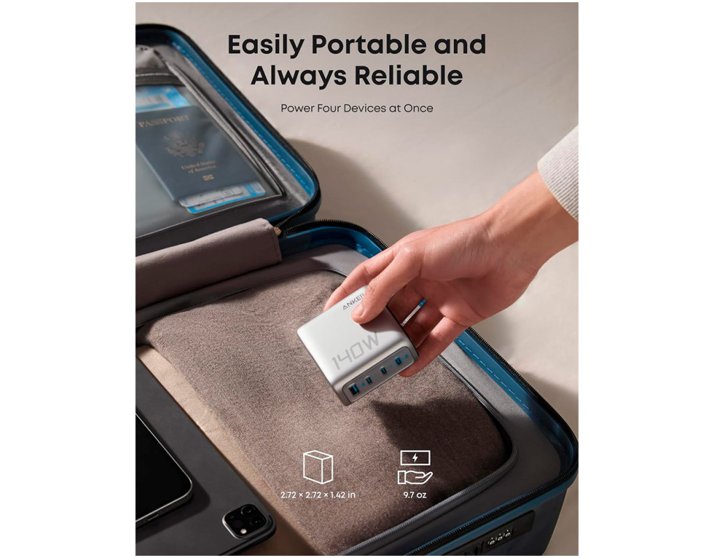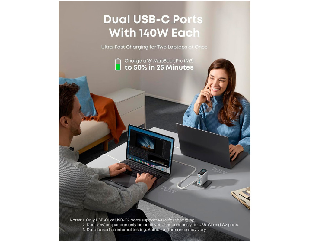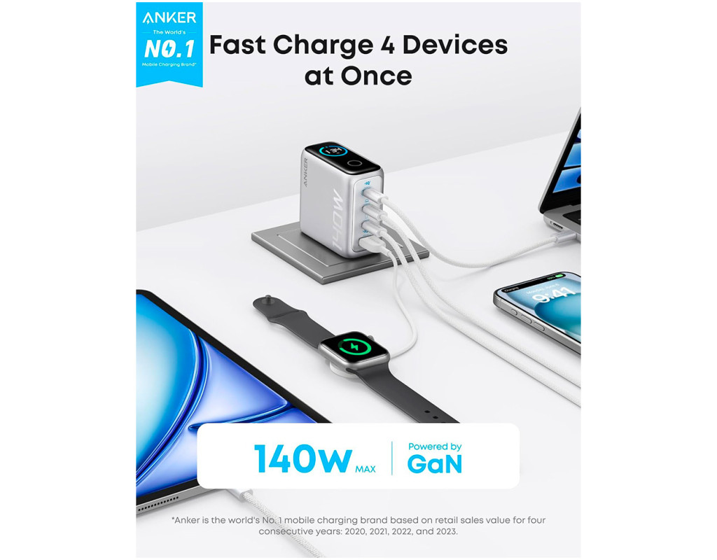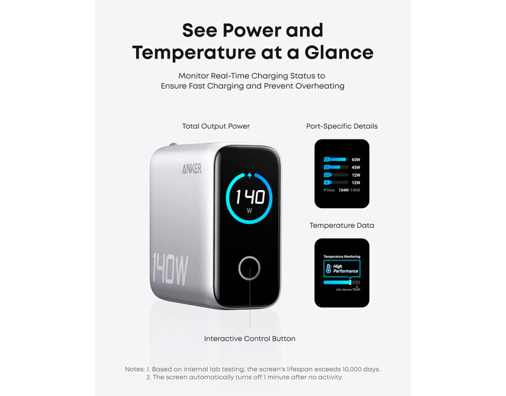 Быстрая зарядка четырех устройств одновременно Мощность для самых требовательных устройств Элегантный. Компактный. Мощный. Стабильность в каждом разъеме Складная вилка и удобное расположение портов делают использование еще более удобным. Информативный дисплей Сенсорный HD-экран показывает в реальном времени: