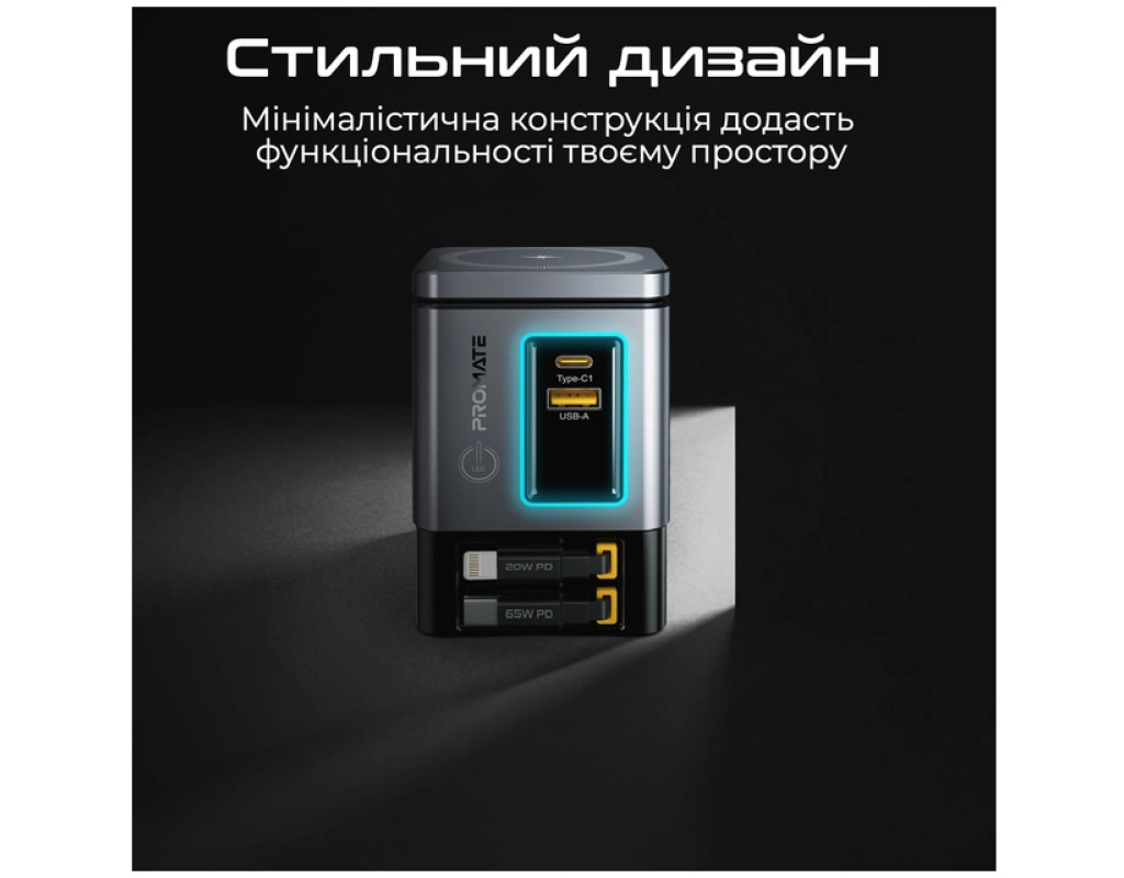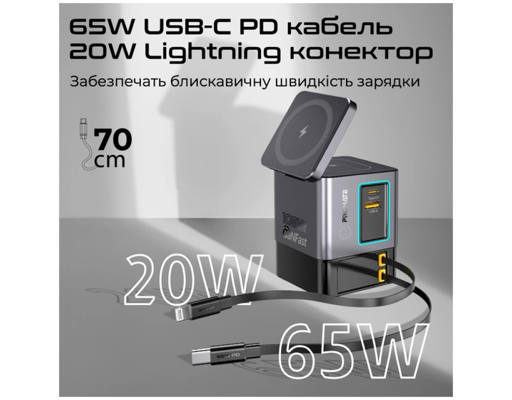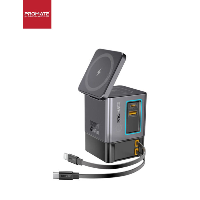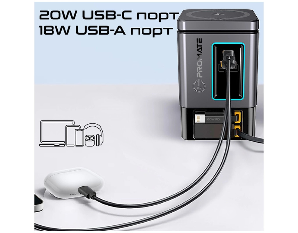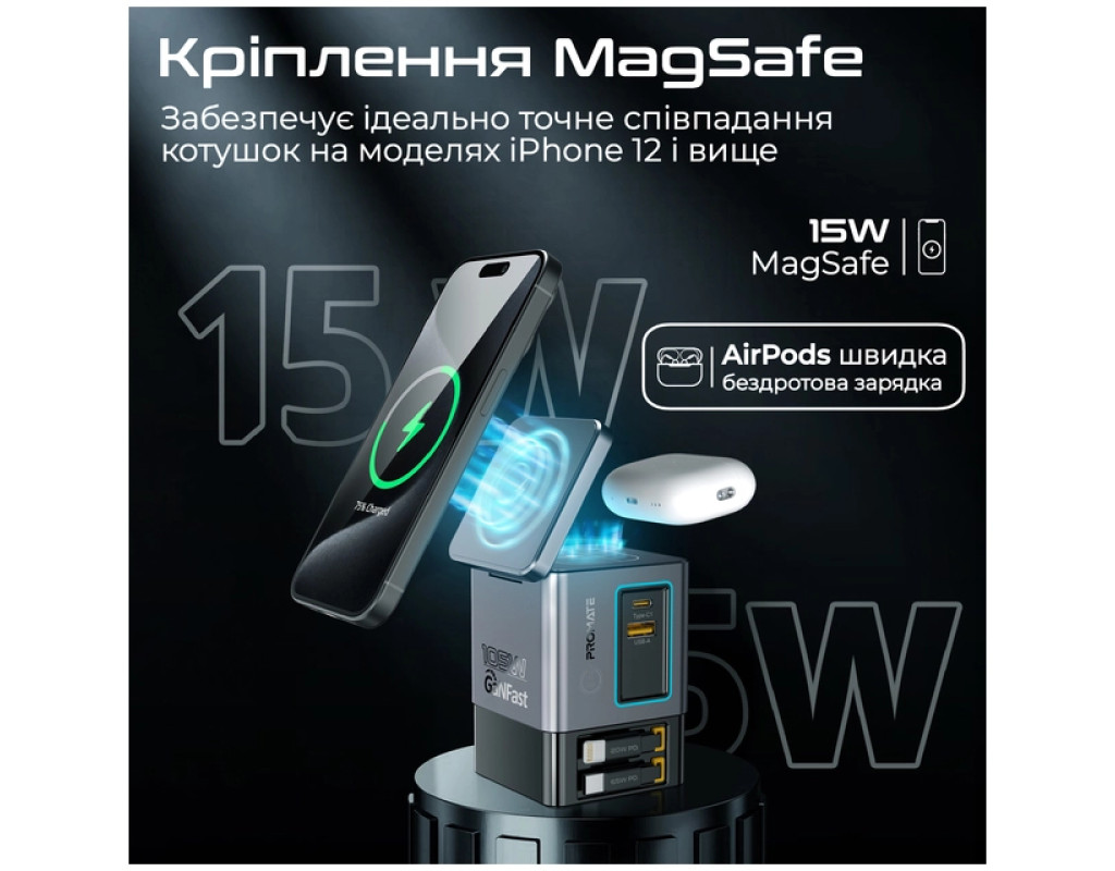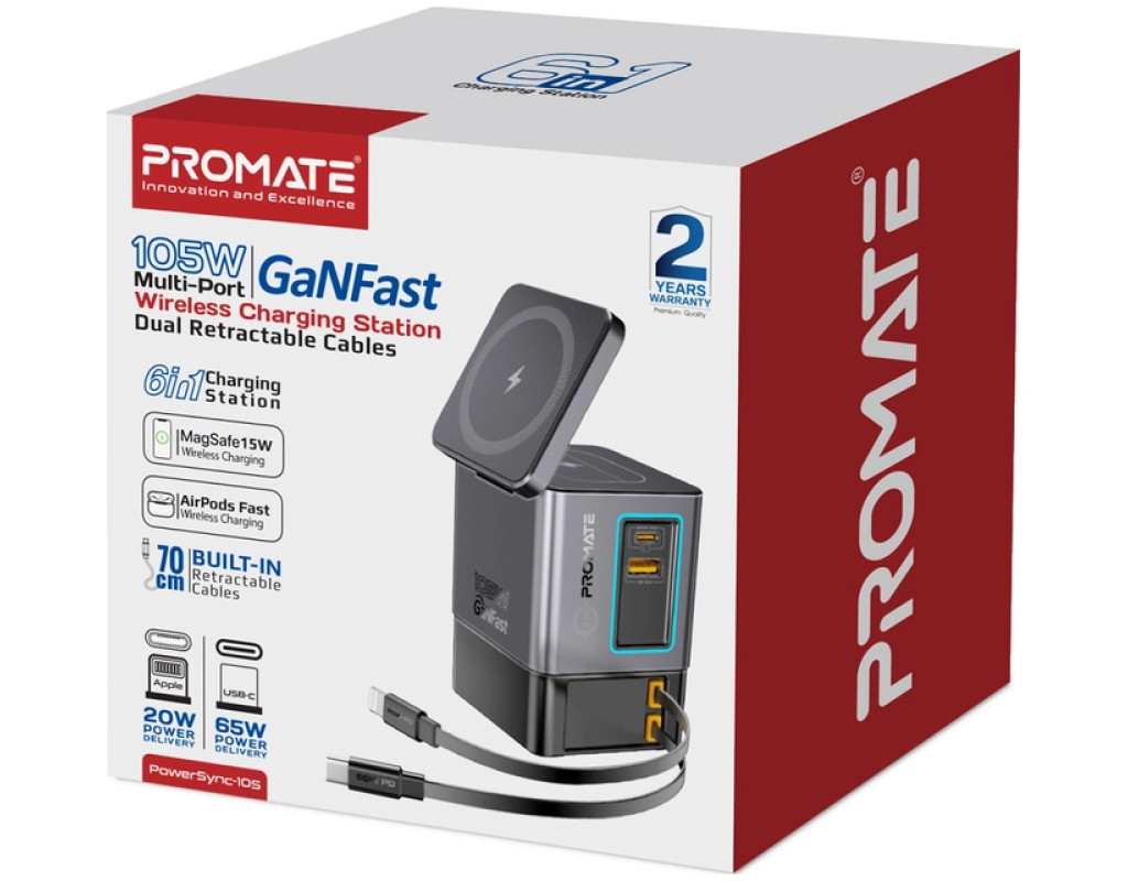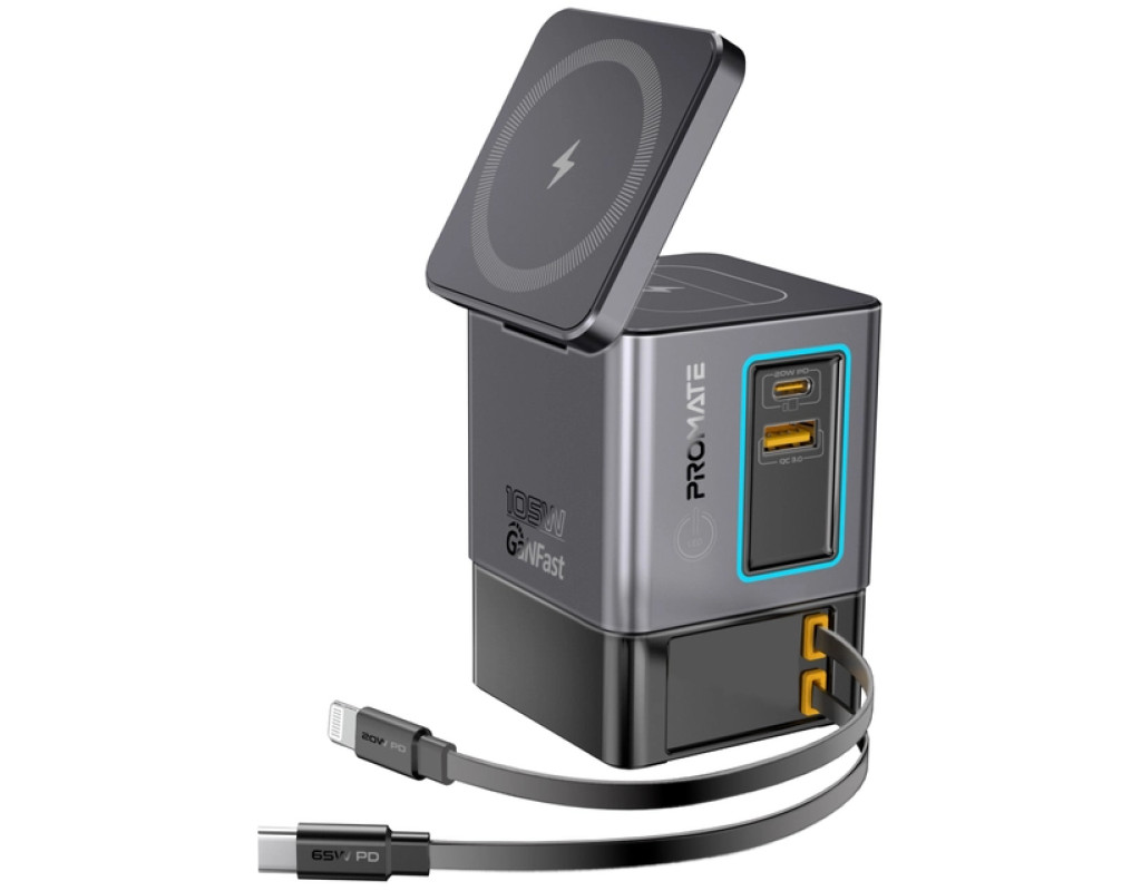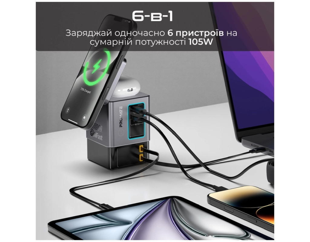 Promate PowerSync-105 – заряжай до 6 устройств одновременно с мощностью до 105W. GaN-технология, магнитная зарядка MagSafe 15W, беспроводная зарядка для AirPods, USB-C PD 65W и Lightning 20W – все в одном стильном решении. Особенности: - 6-в-1: Заряжай одновременно 6 устройств на суммарной мощности 105W.
