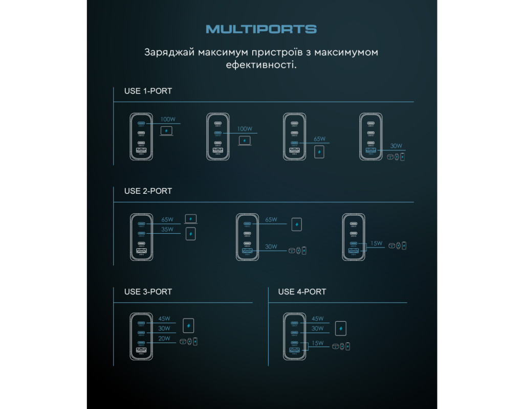 - USB-C1+USB-C2+USB-C3+USB-A: 45Вт+35Вт+15Вт