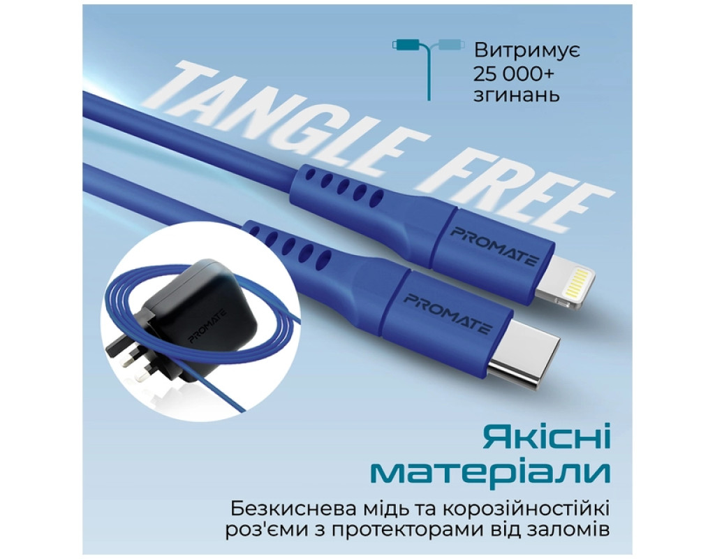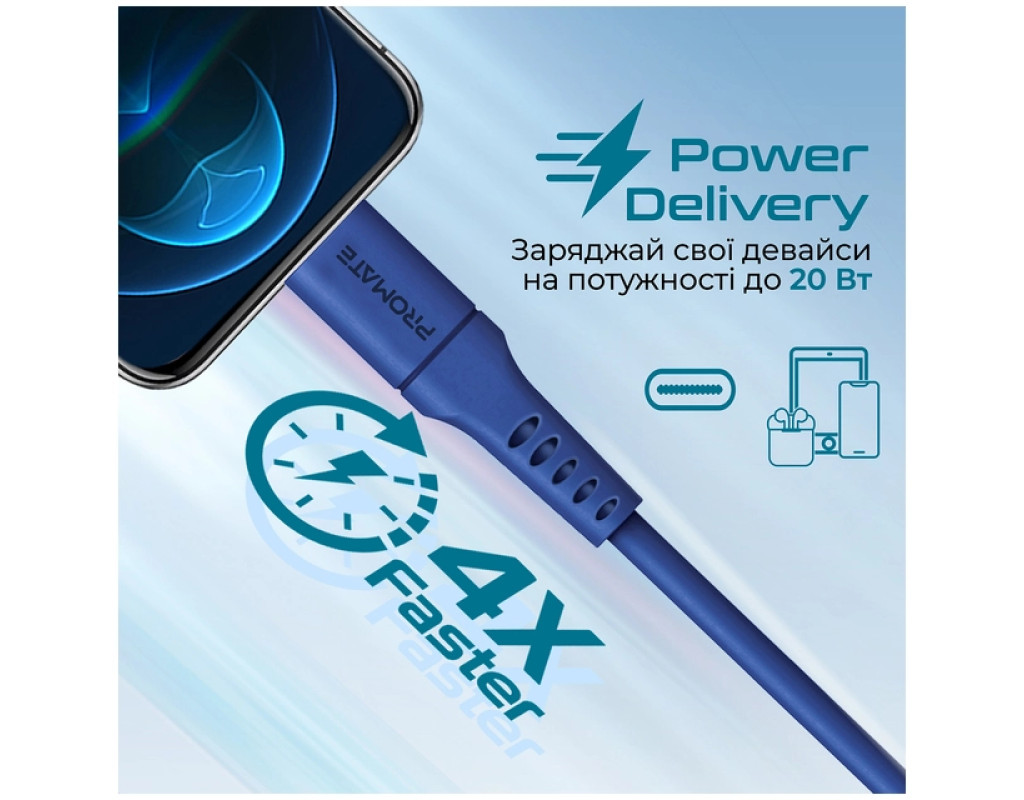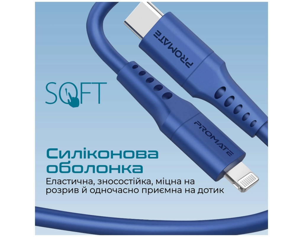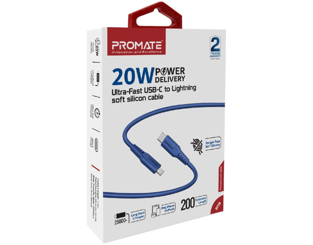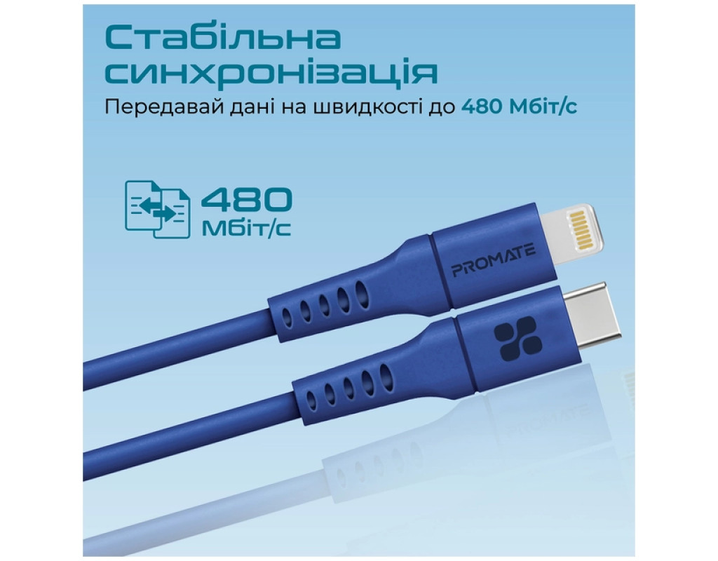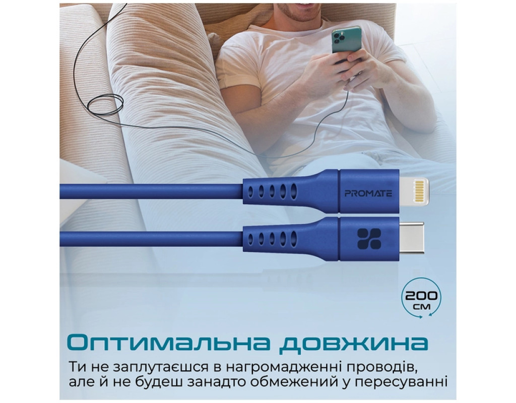Дата кабель USB-C to Lightning 2.0m 3A PowerLink-200 blue Promate (powerlink-200.blue)