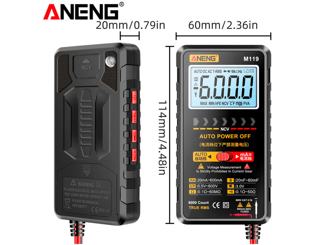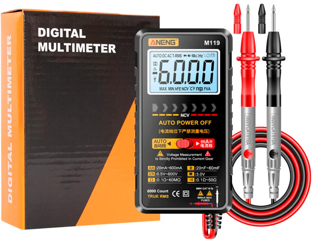 автоматический выбор диапазонов измерений, автоматическое выключение, бесконтактное измерение напряжения (NCV), измерение True RMS, индикация заряда батареи, подсветка дисплея, функция удержания показаний, функция фонарика |