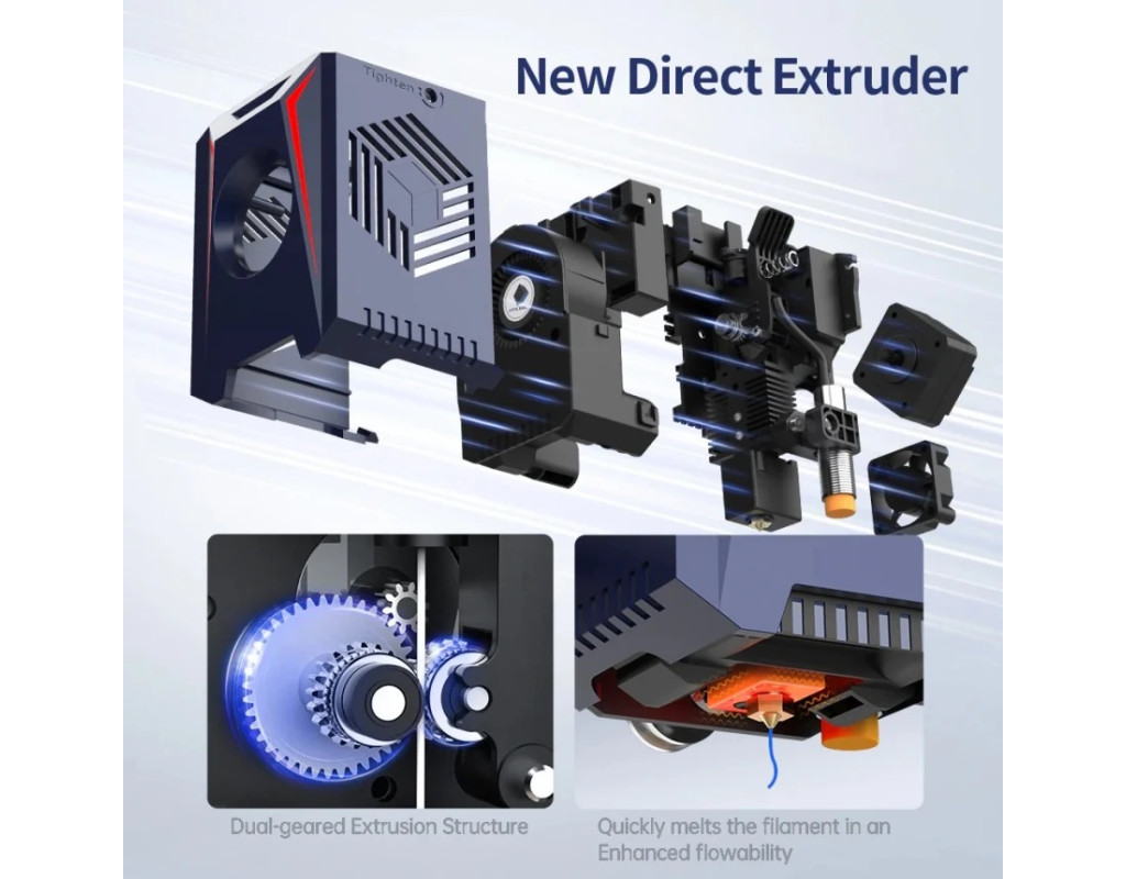 | Обновленная система экструзии: Мощность обновленного экструдера достигает 60 Вт, быстро расплавляет нить в улучшенную текучесть; Двойная экструзионная структура точно контролирует подачу материала.