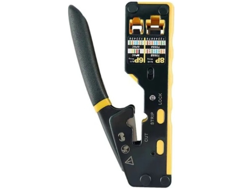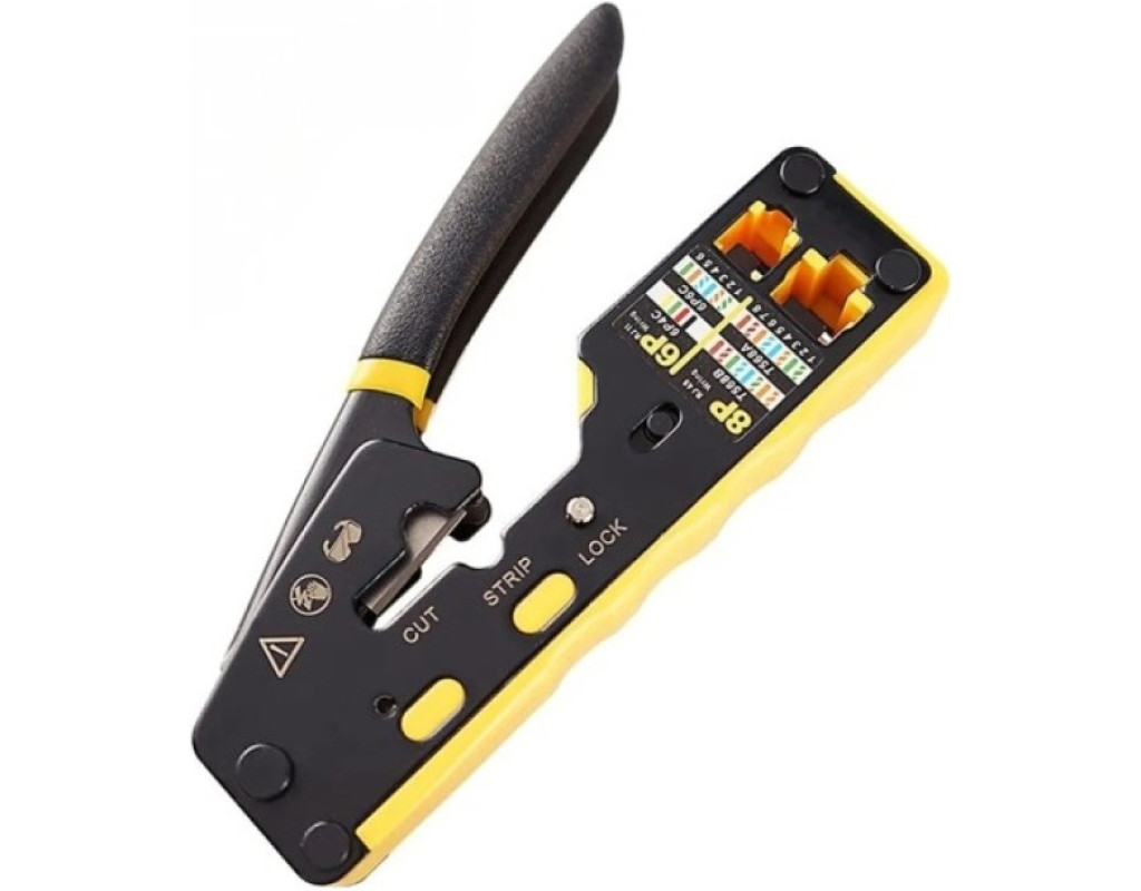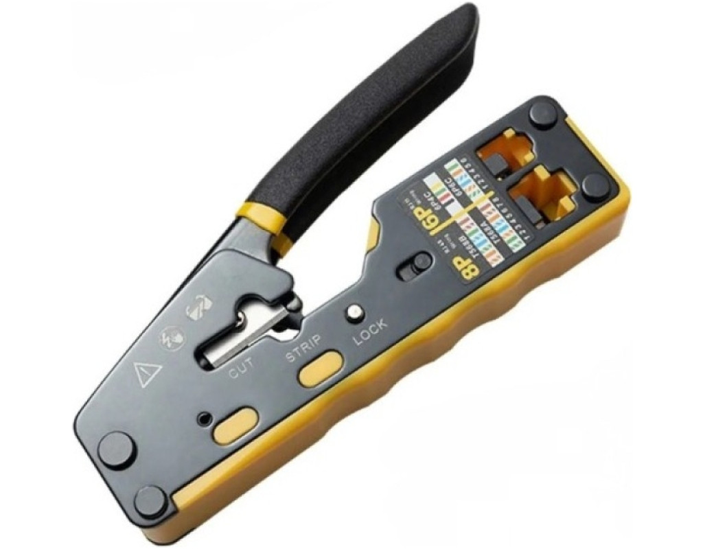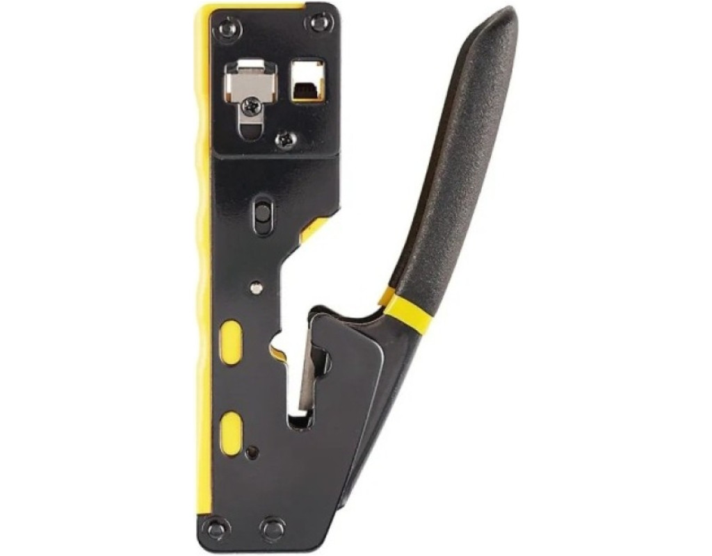 Ручной инструмент для обжимания UTP/STP проходных коннекторов 8P8C/RJ45, и также для телефонных 6P6C/RJ12 и 6P4C/RJ11. Инструмент может быть использован и для обжима и стандартных не сквозных разъёмов RJ45. В корпус инструмента встроен резак для обрезки кабеля, и "стриппер" для сняnия изоляции. В конструкции предусмотрено наличие блокировки, для удобного хранения и транспортировки. Корпус выполнен из стали и пластика, в двухцветном исполнении, более заметный желтый и черный.