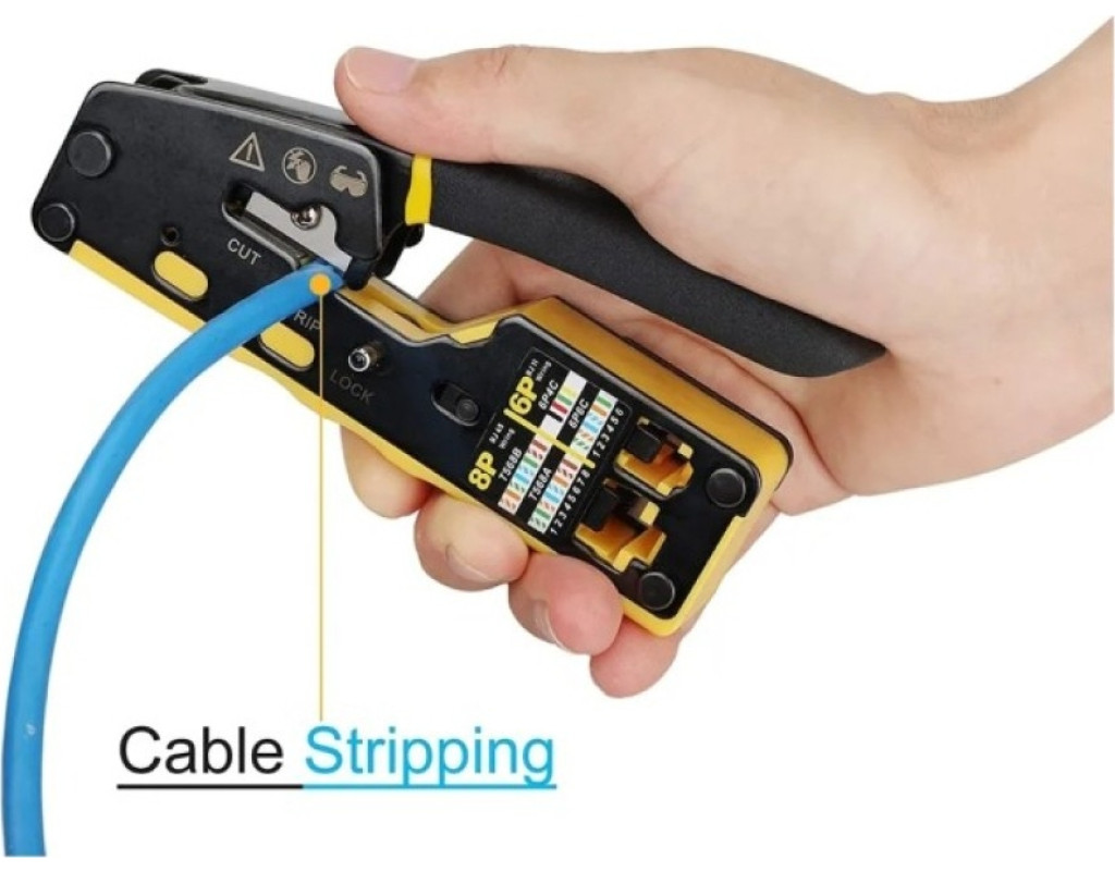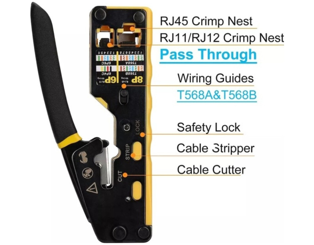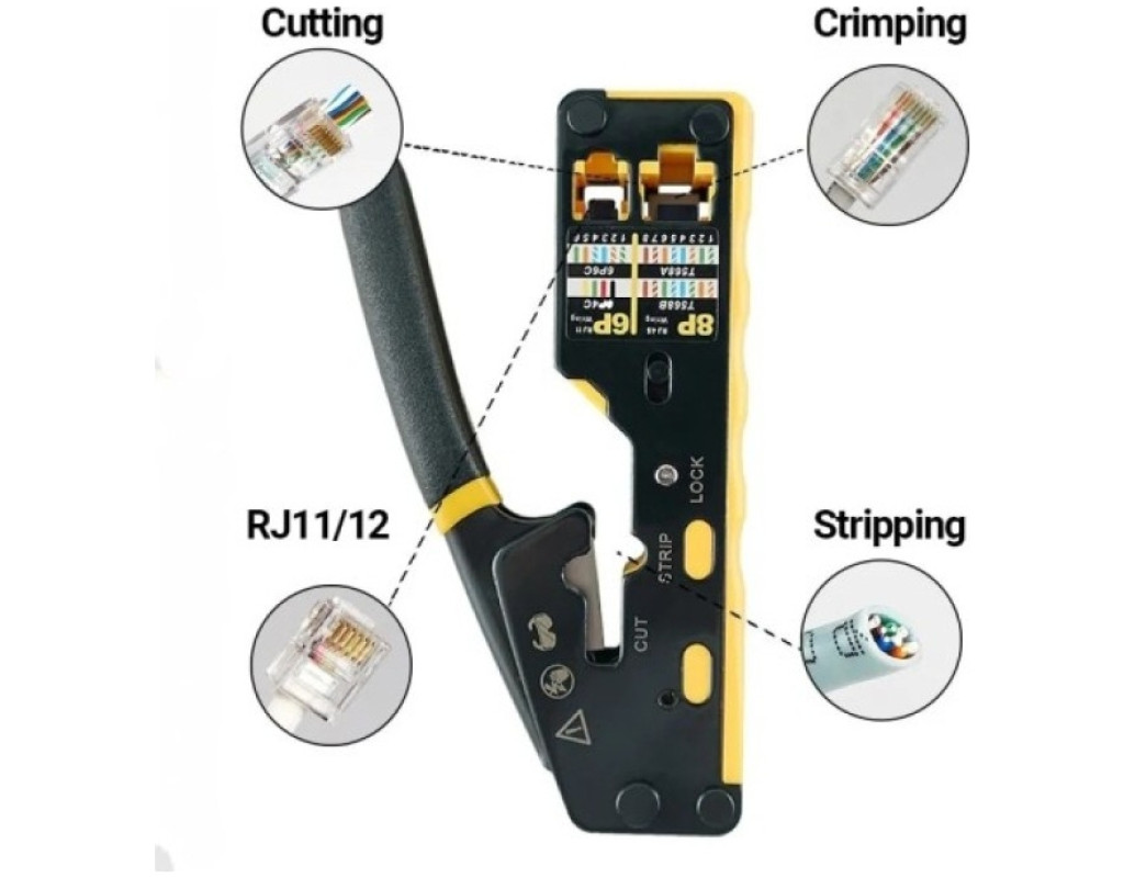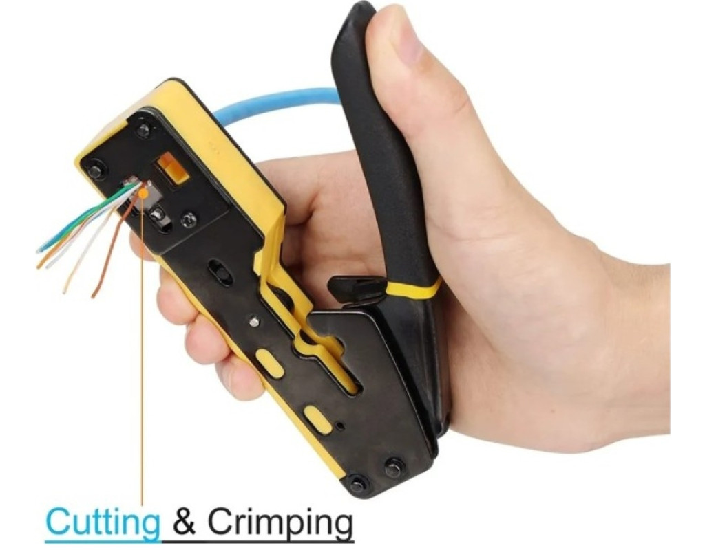 Ручной инструмент для обжимания UTP/STP проходных коннекторов 8P8C/RJ45, и также для телефонных 6P6C/RJ12 и 6P4C/RJ11. Инструмент может быть использован и для обжима и стандартных не сквозных разъёмов RJ45. В корпус инструмента встроен резак для обрезки кабеля, и "стриппер" для сняnия изоляции. В конструкции предусмотрено наличие блокировки, для удобного хранения и транспортировки. Корпус выполнен из стали и пластика, в двухцветном исполнении, более заметный желтый и черный.