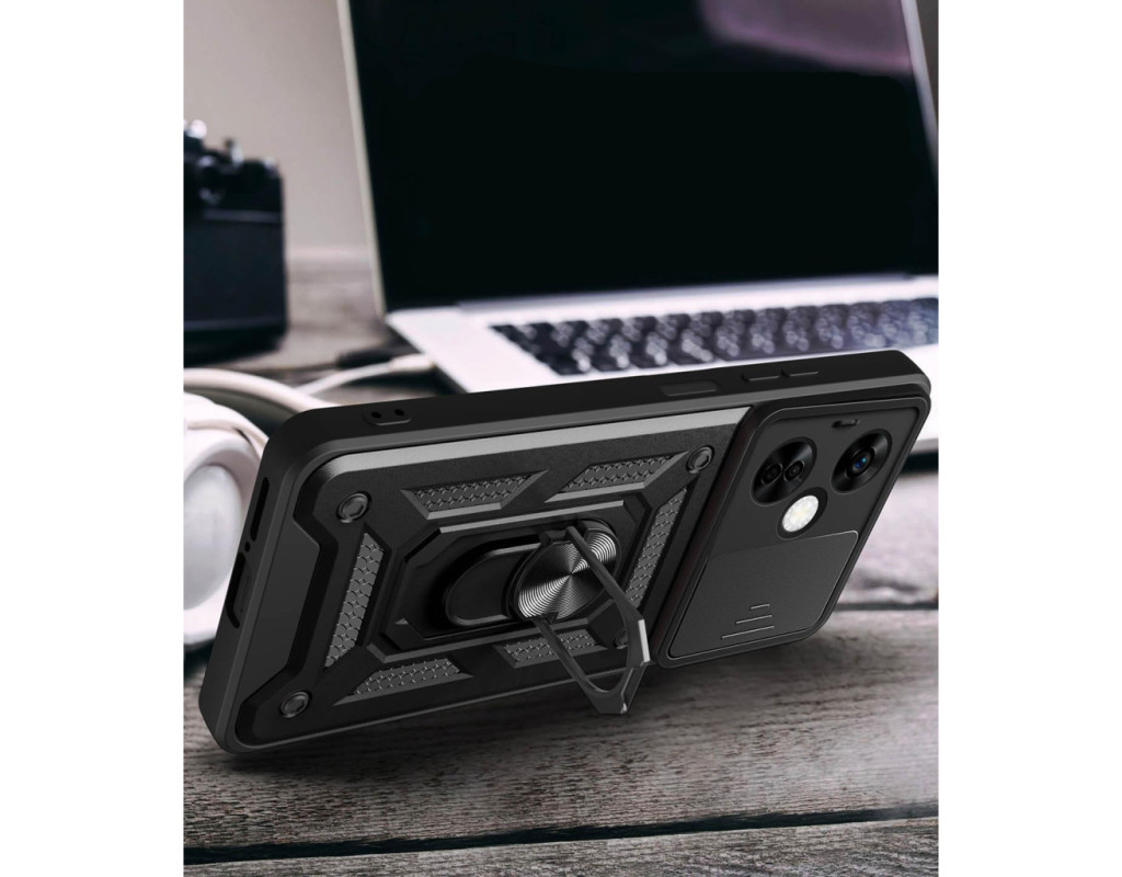 | "Протиударний чохол Military BeCover надійно захищений від будь-яких екстремальних та форс-мажорних ситуацій. Гнучка силіконова панель має жорсткий металізований корпус та кільце-підставку для пальця. Чохол здатний витримати навіть сильні удари та подряпини. Вбудований регульований кронштейн для кільця: кільце, що обертається на 360°, знімається або висувається як підставка, щоб звільнити руки. Це дозволить вам використовувати кільце як підставку для гаджета, використовуючи свій смартфон під час перегляду відео, роблячи фото або користуючись Інтернетом. Чохол приємний на дотик, має протиковзне покриття проти поту та відбитків пальців. М'який тонкий матеріал не пошкоджує мобільний телефон, він ударостійкий і піднятий, утворюючи борти, щоб захистити камеру та екран. Конструкція сумісна з магнітним тримачем (не включаючи магнітне автомобільне кріплення): у цьому випадку може надійно утримувати магнітне автомобільне кріплення та вільно обертатися (не сумісне з бездротовою зарядкою)." |