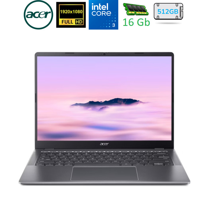 14", 1920x1200 (WUXGA), IPS, Intel Core 3 N355 (1.9 - 3.9 ГГц), 16 ГБ, SSD - 512 ГБ, Intel UHD Graphics, Chrome OS, 53 Втч, сенсорный экран, зарядка от USB, украинская клавиатура, 1.4 кг, серый