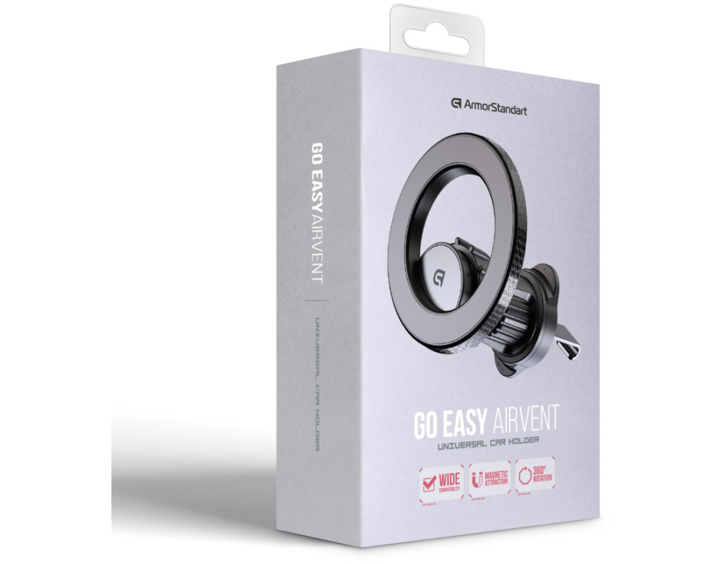 Автоматический держатель ArmorStandart GoEasy Airvent Black — это удобное и надежное решение для фиксации смартфона в салоне автомобиля, которое позволяет держать устройство в удобном для просмотра положении и обеспечивает безопасное управление. Изготовленный из прочного ABS-пластика, этот держатель легко крепится к вентиляционной решетке и остается стабильным даже во время поездок по неровным дорогам. Конструкция предусматривает мощную магнитную систему с магнитами высшего класса N52 , гарантирующими надежное удержание смартфона в любых условиях. Благодаря этому даже на плохих дорогах или во время резких маневров ваше устройство будет оставаться на месте без риска падения. Держатель совместим с MagSafe , что позволяет использовать его без дополнительных металлических пластин с совместимыми iPhone или с чехлами, адаптированными к MagSafe. Для других смартфонов предусмотрены металлические пластины, которые можно закрепить на задней панели устройства или под чехлом. Благодаря вращающейся конструкции с углом поворота 360° , держатель позволяет быстро настроить удобный угол обзора — в вертикальном или горизонтальном положении. Это особенно удобно для навигации, громкой связи или управления музыкой, не отвлекаясь от дороги. ArmorStandart GoEasy Airvent Black совместим с большинством современных смартфонов , независимо от модели и диагонали экрана. Благодаря компактным размерам держатель не мешает обзору дороги и гармонично смотрится в салоне любого автомобиля. Основные преимущества: