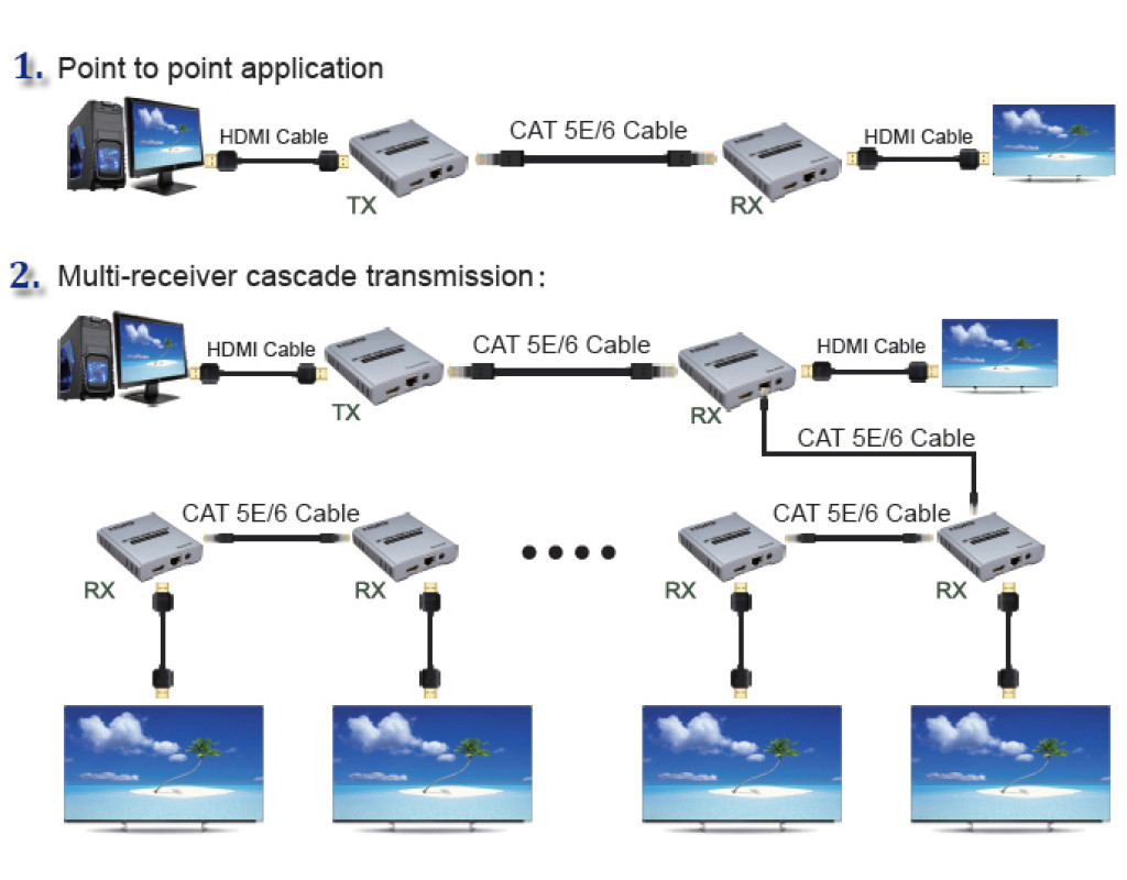 В удлинителе HDMI 4K 120M используется один кабель cat-5E или cat-6 (рекомендуется) вместо кабеля HDMI, вы можете увеличить сигнал HDMI1.3-1080P до 120 метров или HDMI2.0 4K при 60 Гц до 60 метров. Назначение расширителя - обеспечить передачу сигнала на большие расстояния с помощью недорогих кабелей. Особенности: 1. Передача на большие расстояния - 120 м. 2. Многоприемная каскадная передача. 3. Малое энергопотребление, низкая температура и высокая безопасность. |