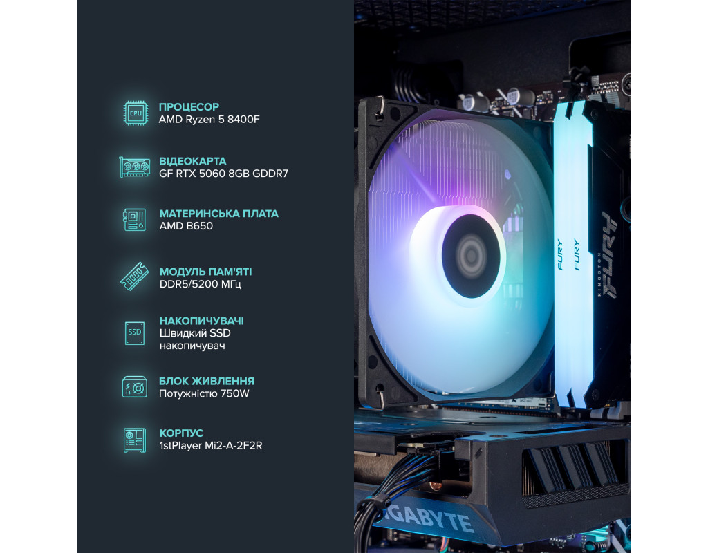 Персональный компьютер ASGARD Eir (A84F.32.S15.56.10178); AMD Ryzen 5 8400F (4.2 - 4.7 ГГц) / ОЗУ 32 ГБ / SSD 1.5 ТБ / NVIDIA GeForce RTX 5060 8 ГБ / без ОП / LAN / Wi-Fi / Bluetooth / Fedora / черный